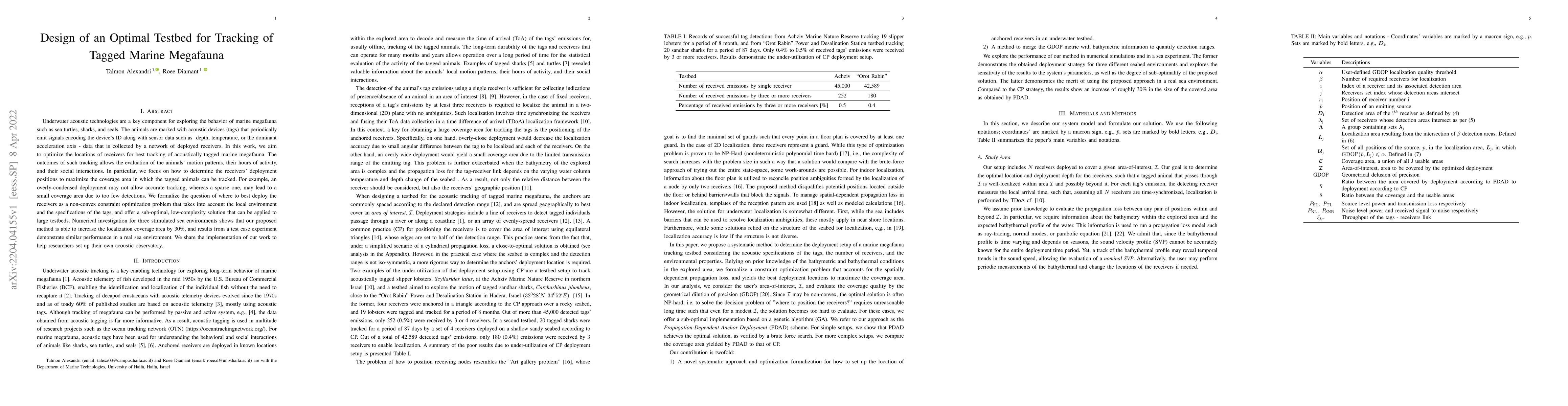 Underwater acoustic technologies are a key component for exploring the behavior of marine megafauna such as sea turtles, sharks, and seals. The animals are marked with acoustic devices (tags) that periodically emit signals encoding the device's ID along with sensor data such as depth, temperature, or the dominant acceleration axis - data that is collected by a network of deployed receivers. In this work, we aim to optimize the locations of receivers for best tracking of acoustically tagged marine megafauna. The outcomes of such tracking allows the evaluation of the animals' motion patterns, their hours of activity, and their social interactions. In particular, we focus on how to determine the receivers' deployment positions to maximize the coverage area in which the tagged animals can be tracked. For example, an overly-condensed deployment may not allow accurate tracking, whereas a sparse one, may lead to a small coverage area due to too few detections. We formalize the question of where to best deploy the receivers as a non-convex constraint optimization problem that takes into account the local environment and the specifications of the tags, and offer a sub-optimal, low-complexity solution that can be applied to large testbeds. Numerical investigation for three stimulated sea environments shows that our proposed method is able to increase the localization coverage area by 30%, and results from a test case experiment demonstrate similar performance in a real sea environment. We share the implementation of our work to help researchers set up their own acoustic observatory.