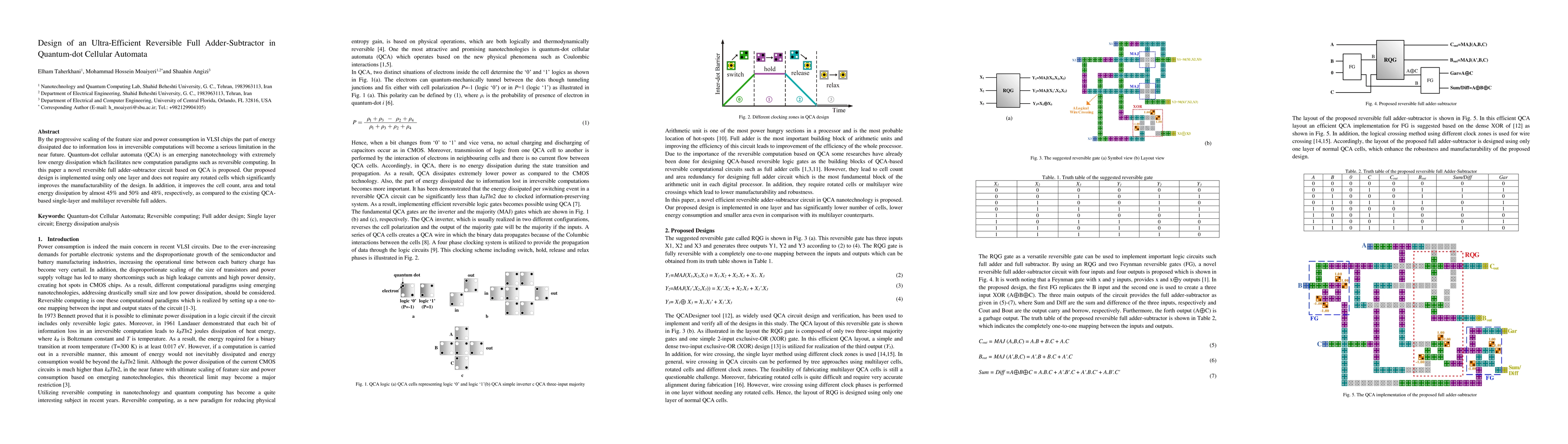 This paper proposes an ultra-efficient reversible full adder-subtractor circuit in quantum-dot cellular automata (QCA) to reduce energy dissipation. The design uses a single layer and avoids rotated cells, improving manufacturability, and achieves a 45% reduction in cell count, 50% in area, and 48% in energy dissipation compared to existing QCA designs.