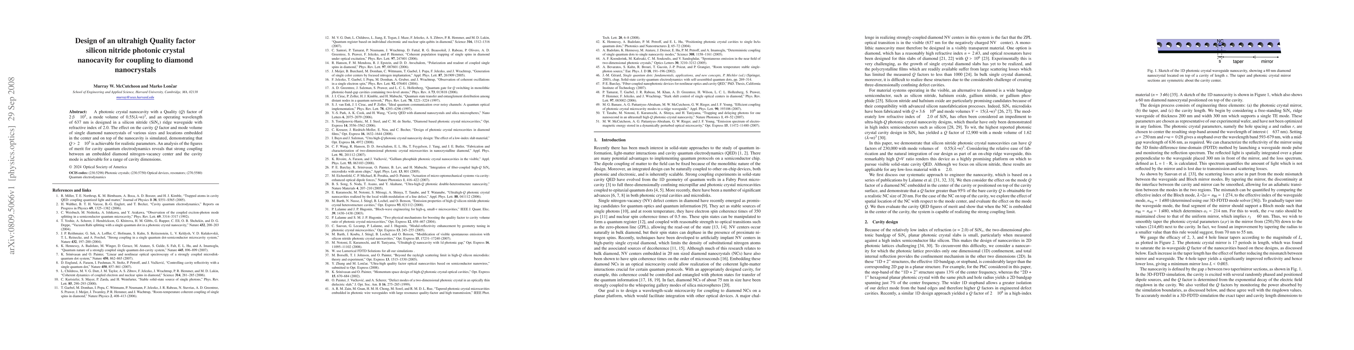 A photonic crystal nanocavity with a Quality (Q) factor of 2.3 x 10^5, a mode volume of 0.55($\lambda/n$)^3, and an operating wavelength of 637 nm is designed in a silicon nitride (SiN_x) ridge waveguide with refractive index of 2.0. The effect on the cavity Q factor and mode volume of single diamond nanocrystals of various sizes and locations embedded in the center and on top of the nanocavity is simulated, demonstrating that Q > 2 x 10^5 is achievable for realistic parameters. An analysis of the figures of merit for cavity quantum electrodynamics reveals that strong coupling between an embedded diamond nitrogen-vacancy center and the cavity mode is achievable for a range of cavity dimensions.
