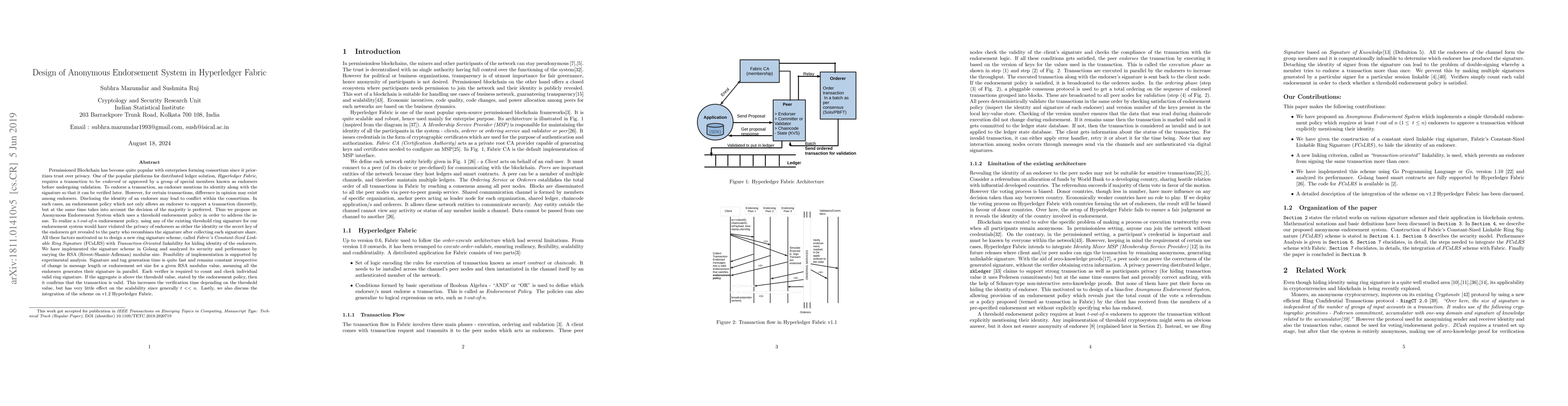 This paper proposes an Anonymous Endorsement System for Hyperledger Fabric using a Fabric Constant-Sized Linkable Ring Signature (FCsLRS) scheme to allow endorsers to support transactions discreetly while considering majority decisions. The scheme's security and performance are analyzed, showing fast and constant signature generation time, and it is successfully integrated into v1.2 Hyperledger Fabric.