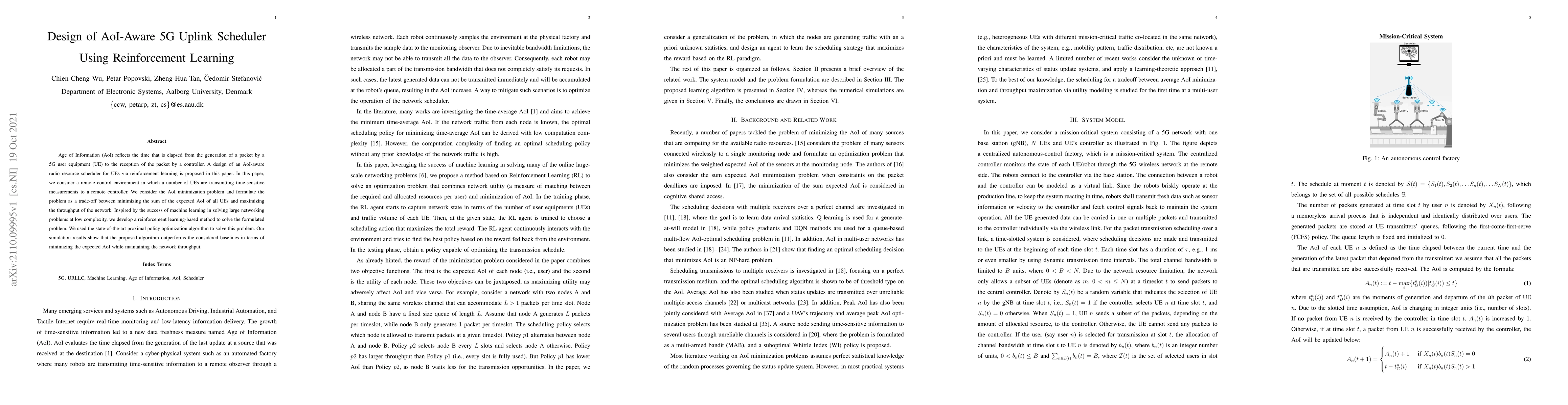 A 5G network scheduler is designed to minimize Age of Information (AoI) while maintaining network throughput using reinforcement learning. The proposed algorithm outperforms baselines in minimizing expected AoI.