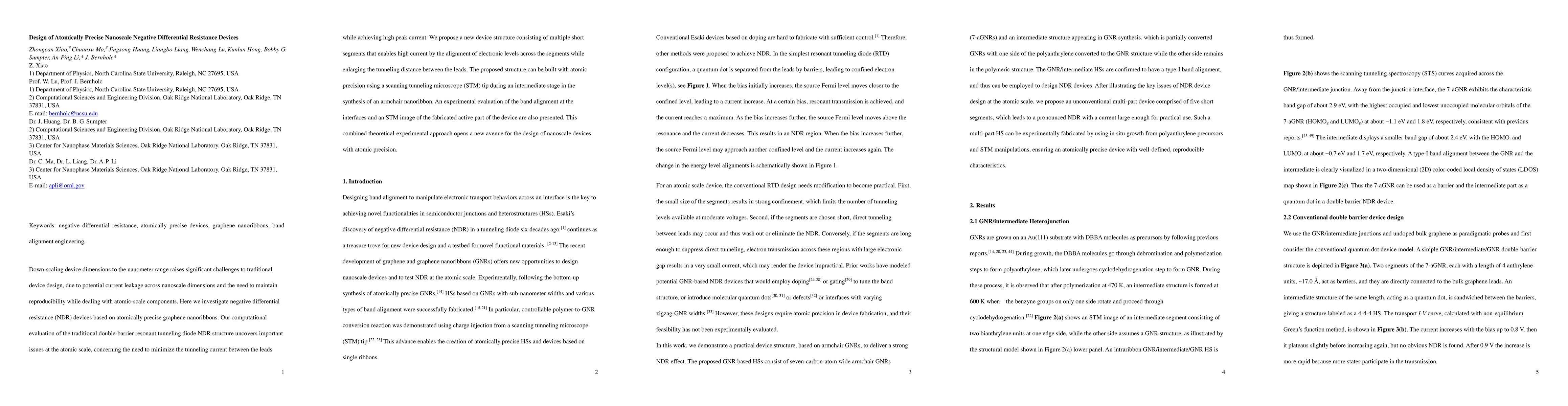 This paper explores the design of nanoscale negative differential resistance (NDR) devices based on atomically precise graphene nanoribbons, proposing a new structure that maximizes current through electronic level alignment while minimizing tunneling current. The study combines computational and experimental methods to demonstrate feasibility, marking a significant step towards atomically precise device fabrication.