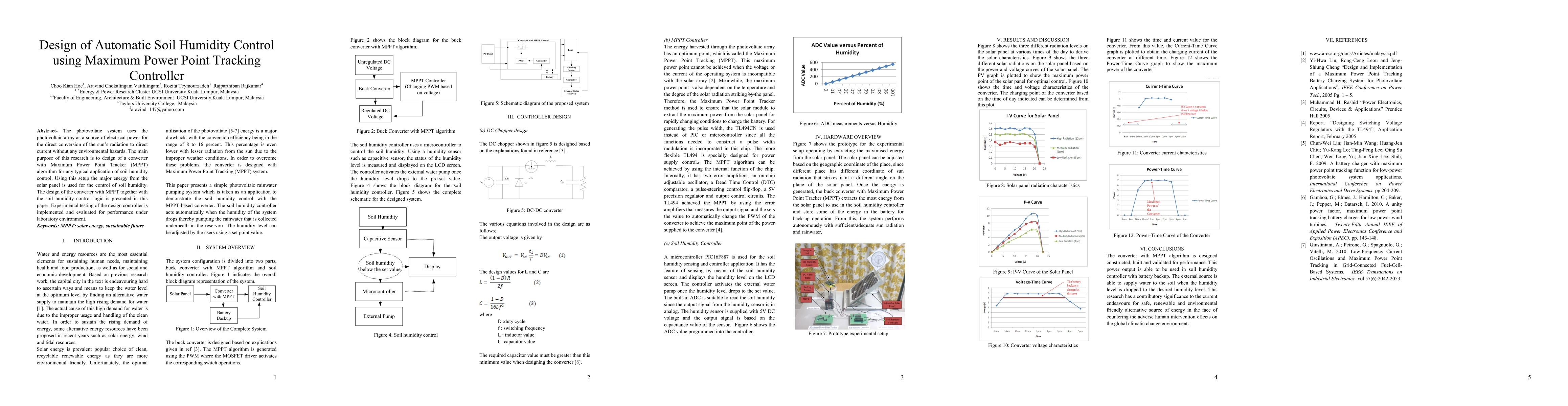 The photovoltaic system uses the photovoltaic array as a source of electrical power for the direct conversion of the sun radiation to direct current without any environmental hazards. The main purpose of this research is to design a converter with Maximum Power Point Tracker MPPT algorithm for any typical application of soil humidity control. Using this setup the major energy from the solar panel is used for the control of soil humidity. The design of the converter with MPPT together with the soil humidity control logic is presented in this paper. Experimental testing of the designed controller is implemented and evaluated for performance under laboratory environment.