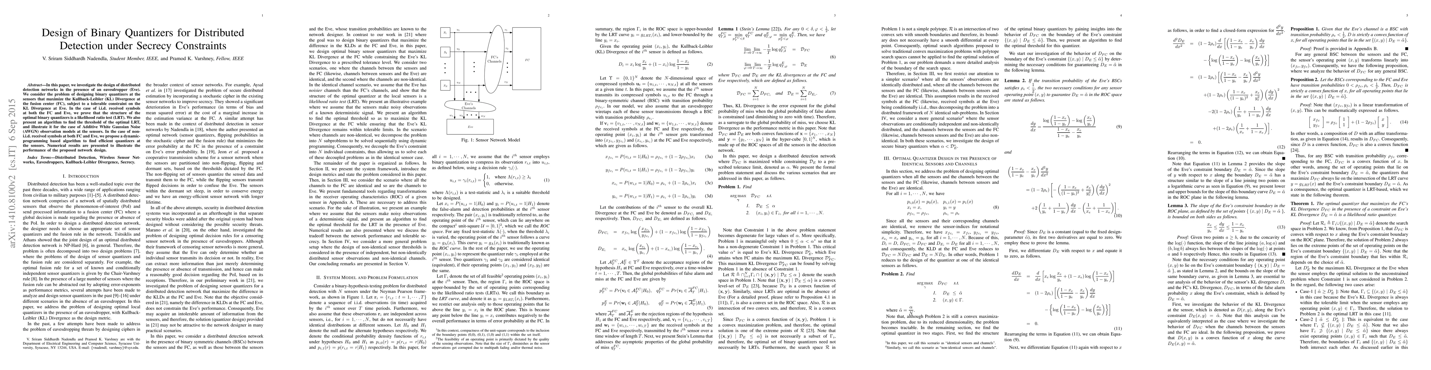 This paper explores designing binary quantizers for distributed detection networks, ensuring secrecy from eavesdroppers. For i.i.d. received symbols, optimal quantizers are proven to follow a likelihood ratio test structure, with an algorithm to find the threshold for AWGN observation models. For non-i.i.d. symbols, a dynamic programming algorithm is proposed to find efficient quantizers, with illustrative numerical results.