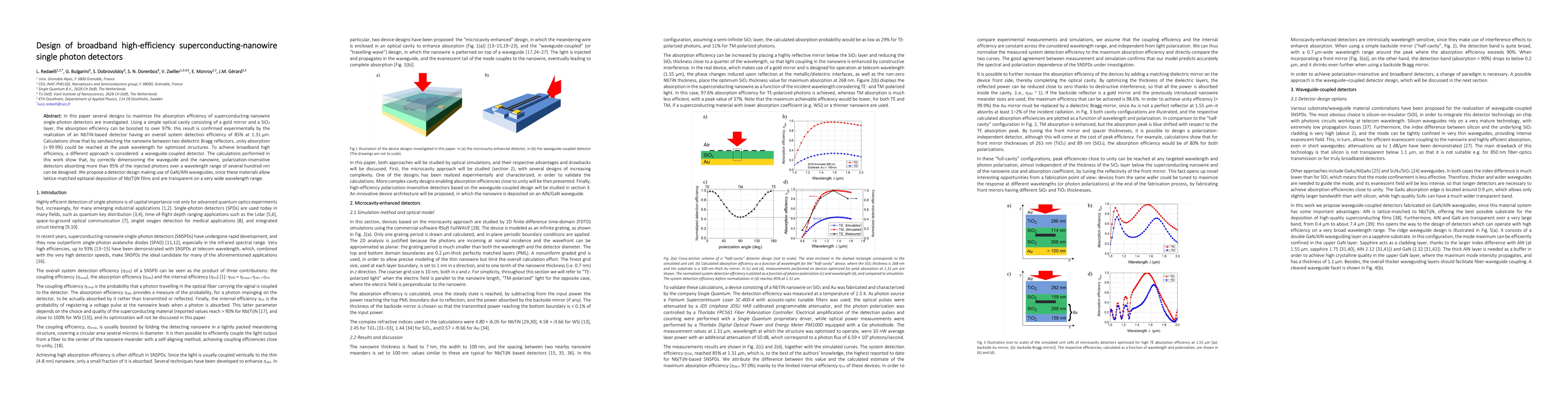 This paper explores various designs to enhance the efficiency of superconducting-nanowire single-photon detectors, achieving over 97% absorption efficiency using a simple optical cavity. The study also proposes a waveguide-coupled detector for broadband high efficiency, demonstrating polarization-insensitive absorption of over 95% across a wide wavelength range.