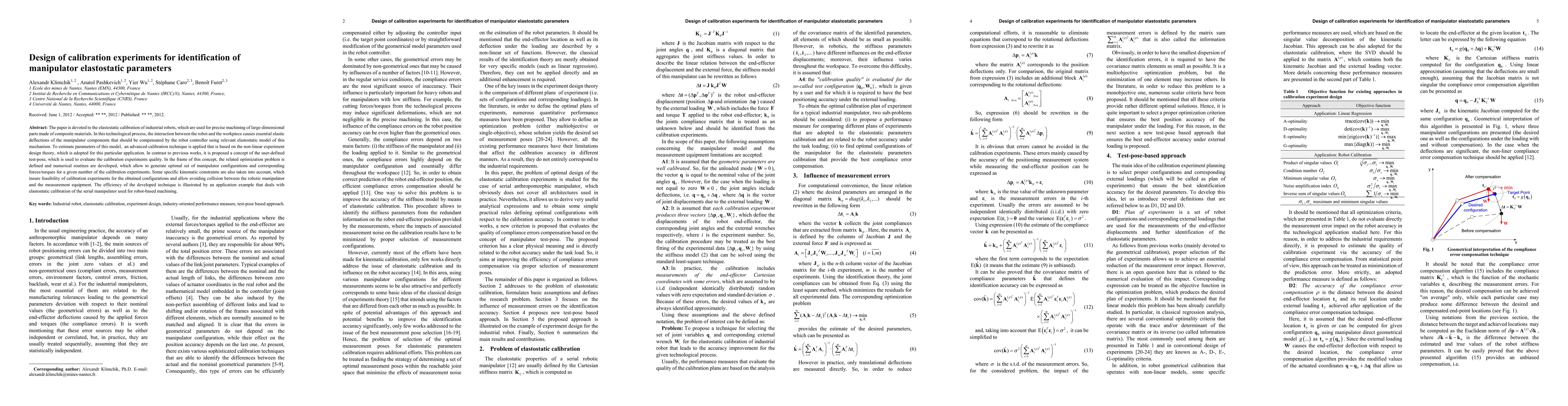 This paper presents an advanced calibration technique for industrial robots used in precise machining of large composite parts, employing non-linear experiment design to identify elastostatic parameters. It introduces a user-defined test-pose concept for evaluating calibration experiment quality, optimizing configurations and forces/torques while considering kinematic constraints to avoid collisions.
