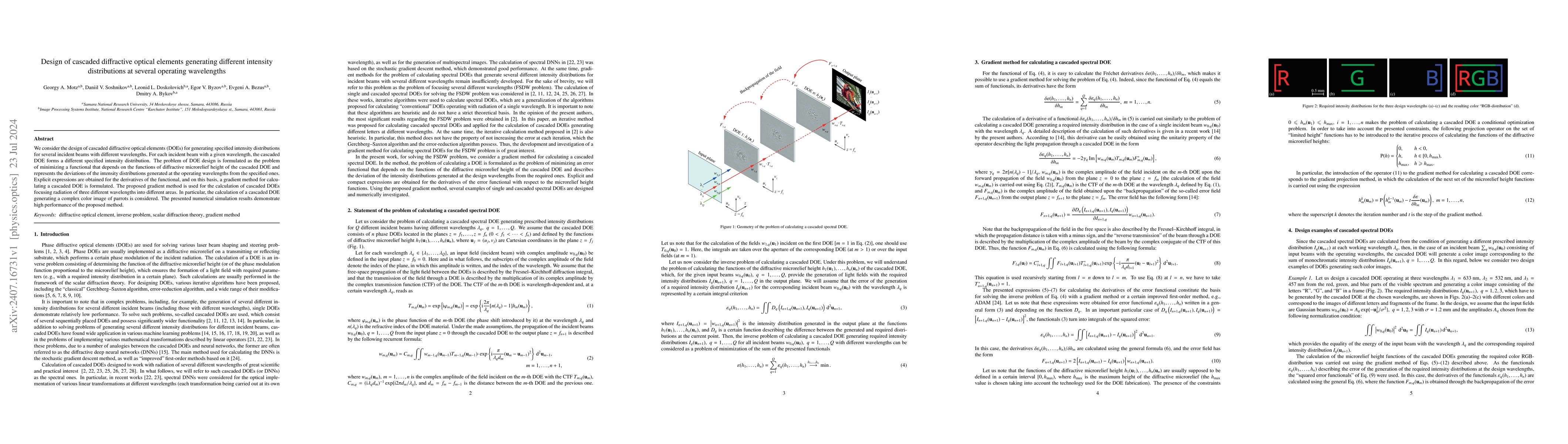 This research presents a gradient method for designing cascaded diffractive optical elements (DOEs) that generate specified intensity distributions for different wavelengths. The method formulates the design problem as a minimization task and successfully applies it to focus radiation of three different wavelengths into distinct areas, including a complex color image simulation.