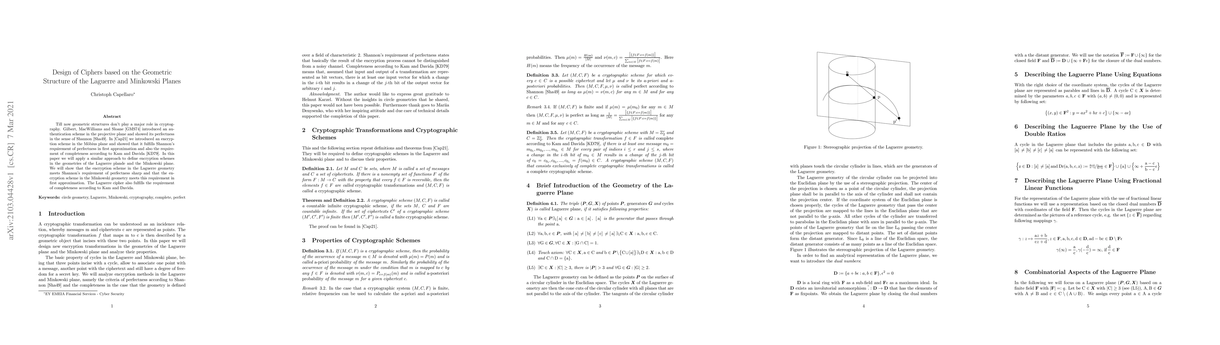 This paper presents encryption schemes in the geometries of the Laguerre and Minkowski planes, demonstrating that the Laguerre cipher meets Shannon's perfectness requirement exactly and the Minkowski cipher in first approximation. Both schemes also satisfy Kam and Davida's completeness requirement.
