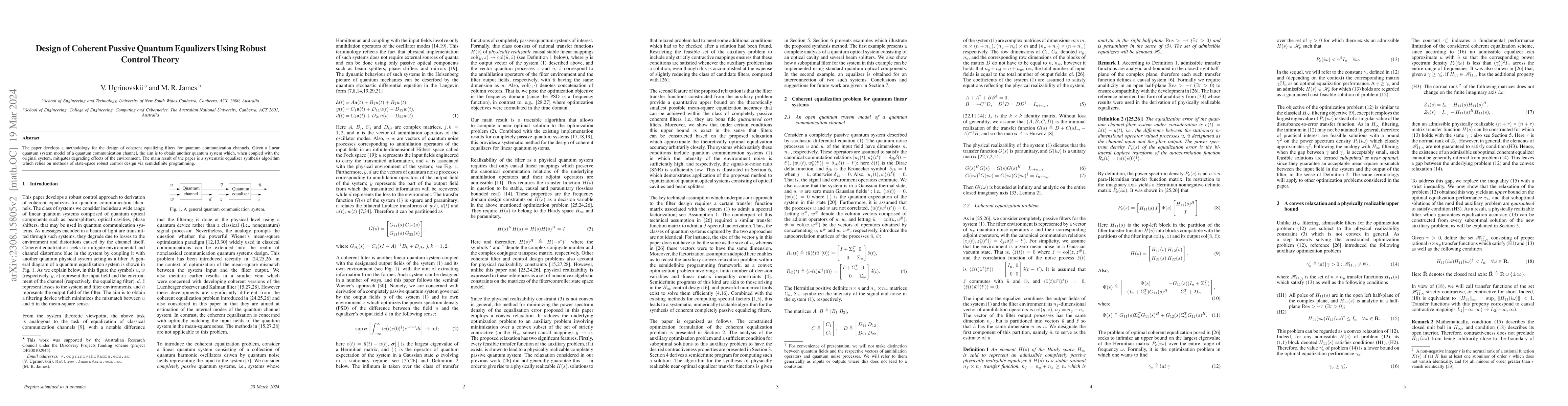 This paper presents an equalizer design methodology for quantum communication channels, utilizing robust control theory and semidefinite programming to mitigate environmental degradation effects through a synthesized coherent passive quantum equalizer. The developed algorithm is grounded in state-space control design.