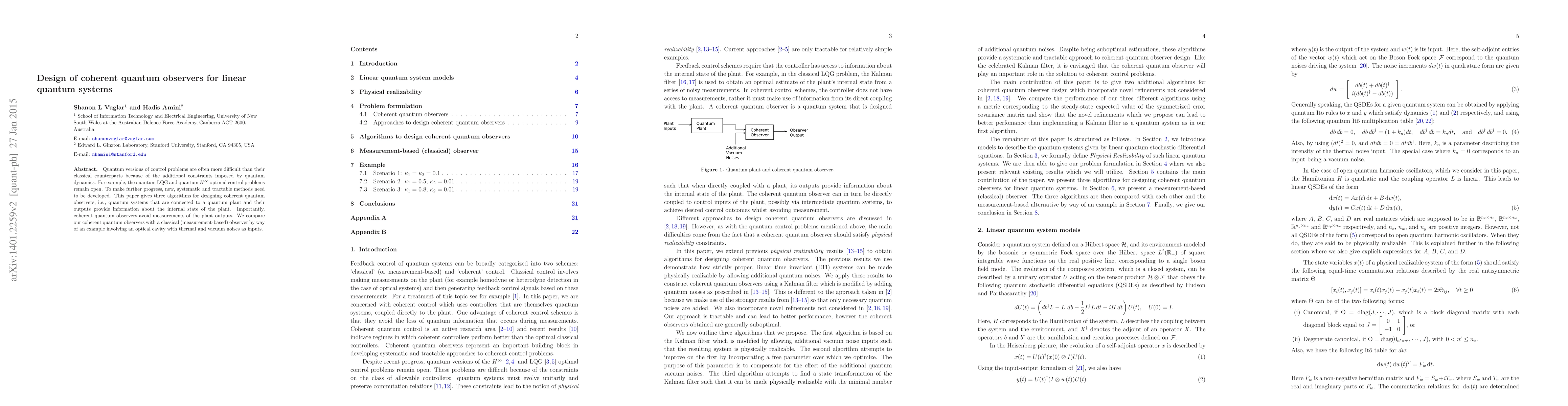 Quantum versions of control problems are often more difficult than their classical counterparts because of the additional constraints imposed by quantum dynamics. For example, the quantum LQG and quantum H infinity optimal control problems remain open. To make further progress, new, systematic and tractable methods need to be developed. This paper gives three algorithms for designing coherent observers, i.e., quantum systems that are connected to a quantum plant and their outputs provide information about the internal state of the plant. Importantly, coherent observers avoid measurements of the plant outputs. We compare our coherent observers with a classical (measurement-based) observer by way of an example involving an optical cavity with thermal and vacuum noises as inputs.