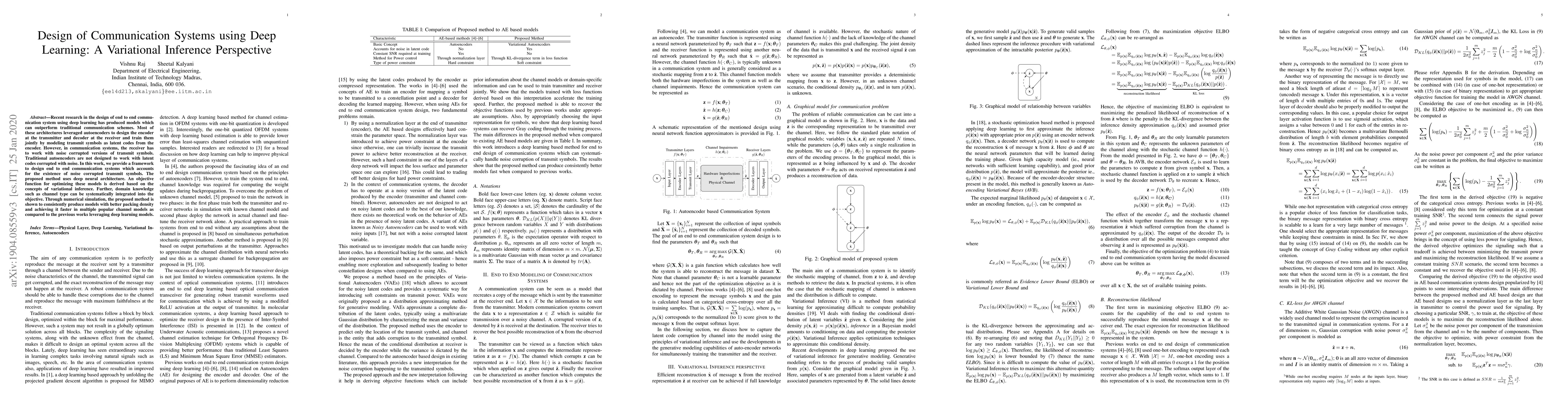Recent research in the design of end to end communication system using deep learning has produced models which can outperform traditional communication schemes. Most of these architectures leveraged autoencoders to design the encoder at the transmitter and decoder at the receiver and train them jointly by modeling transmit symbols as latent codes from the encoder. However, in communication systems, the receiver has to work with noise corrupted versions of transmit symbols. Traditional autoencoders are not designed to work with latent codes corrupted with noise. In this work, we provide a framework to design end to end communication systems which accounts for the existence of noise corrupted transmit symbols. The proposed method uses deep neural architecture. An objective function for optimizing these models is derived based on the concepts of variational inference. Further, domain knowledge such as channel type can be systematically integrated into the objective. Through numerical simulation, the proposed method is shown to consistently produce models with better packing density and achieving it faster in multiple popular channel models as compared to the previous works leveraging deep learning models.