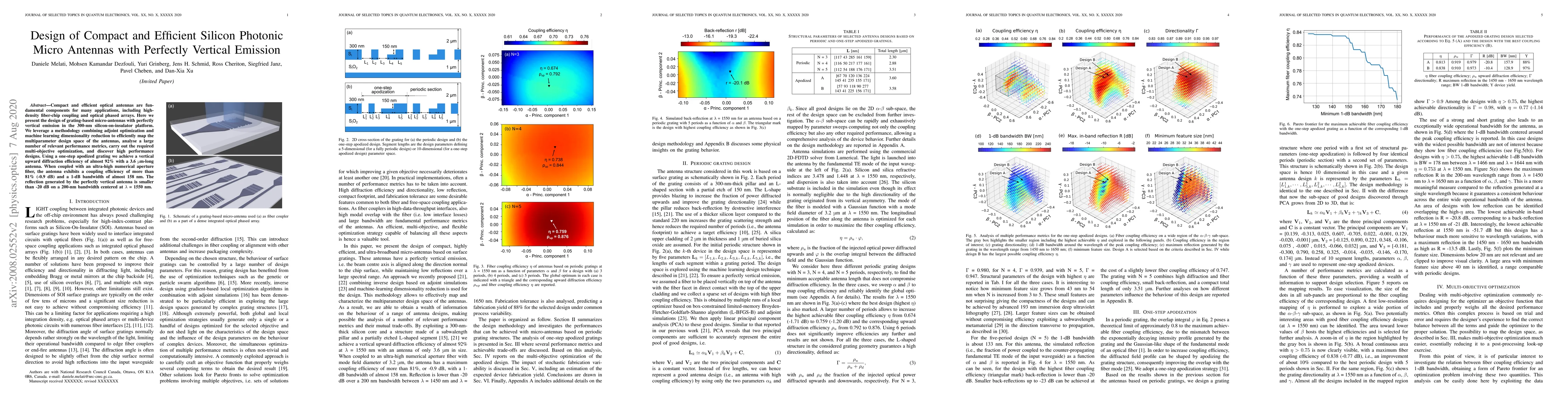 This paper designs compact and efficient silicon photonic micro-antennas with perfectly vertical emission using a grating-based approach on a silicon-on-insulator platform. The authors achieve a vertical diffraction efficiency of nearly 92% and a coupling efficiency of over 81% with an ultra-high numerical aperture fiber, demonstrating significant potential for high-density fiber-chip coupling and optical phased arrays.