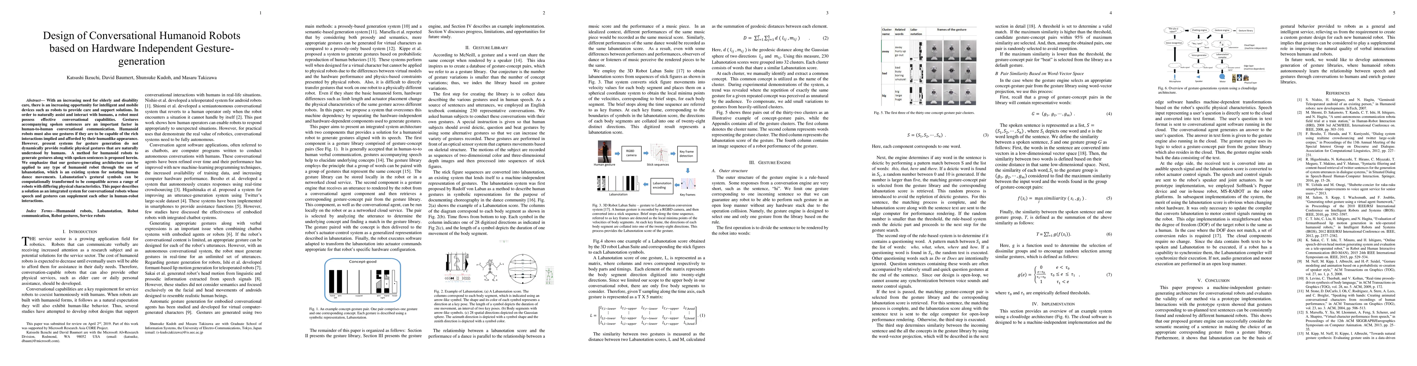 With an increasing need for elderly and disability care, there is an increasing opportunity for intelligent and mobile devices such as robots to provide care and support solutions. In order to naturally assist and interact with humans, a robot must possess effective conversational capabilities. Gestures accompanying spoken sentences are an important factor in human-to-human conversational communication. Humanoid robots must also use gestures if they are to be capable of the rich interactions implied and afforded by their humanlike appearance. However, present systems for gesture generation do not dynamically provide realistic physical gestures that are naturally understood by humans. A method for humanoid robots to generate gestures along with spoken sentences is proposed herein. We emphasize that our gesture-generating architecture can be applied to any type of humanoid robot through the use of labanotation, which is an existing system for notating human dance movements. Labanotation's gesture symbols can computationally transformed to be compatible across a range of robots with doddering physical characteristics. This paper describes a solution as an integrated system for conversational robots whose speech and gestures can supplement each other in human-robot interaction.
