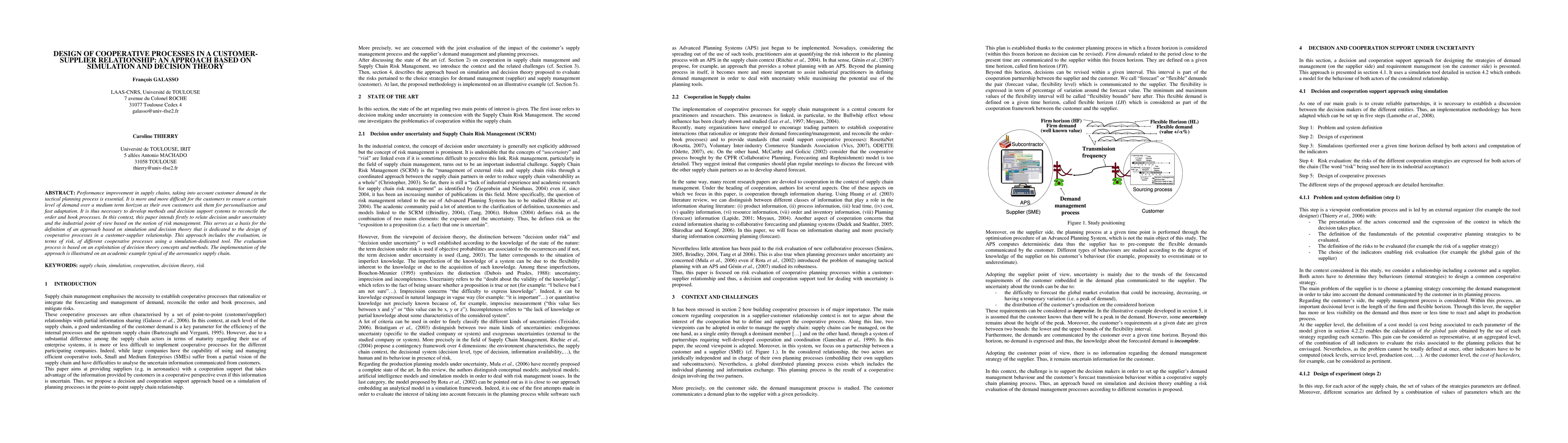 Performance improvement in supply chains, taking into account customer demand in the tactical planning process is essential. It is more and more difficult for the customers to ensure a certain level of demand over a medium term horizon as their own customers ask them for personalisation and fast adaptation. It is thus necessary to develop methods and decision support systems to reconcile the order and book processes. In this context, this paper intends firstly to relate decision under uncertainty and the industrial point of view based on the notion of risk management. This serves as a basis for the definition of an approach based on simulation and decision theory that is dedicated to the design of cooperative processes in a customer-supplier relationship. This approach includes the evaluation, in terms of risk, of different cooperative processes using a simulation-dedicated tool. The evaluation process is based on an exploitation of decision theory concepts and methods. The implementation of the approach is illustrated on an academic example typical of the aeronautics supply chain.