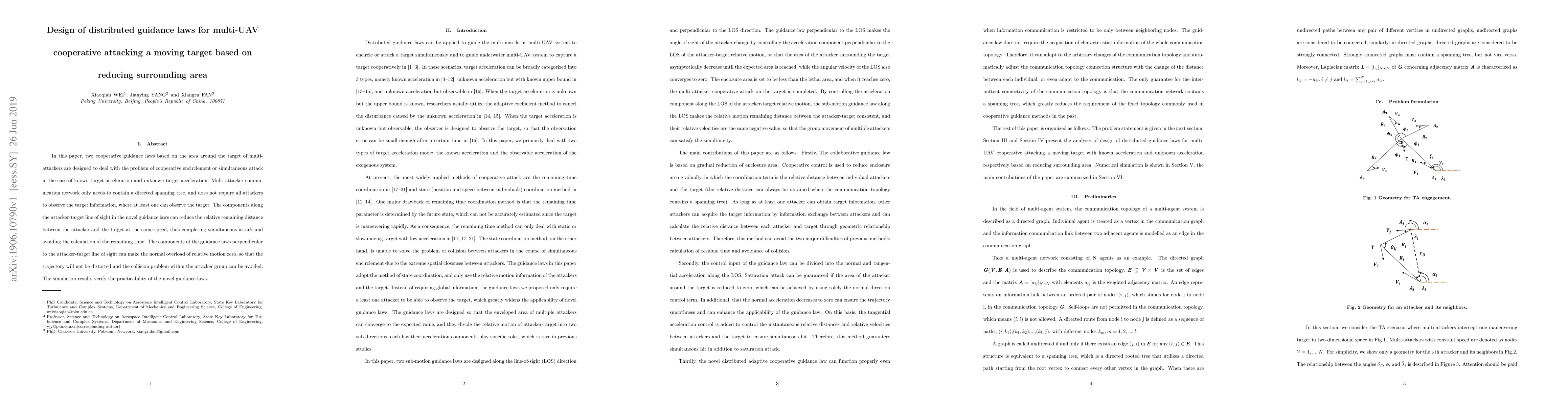 This paper proposes two cooperative guidance laws for multi-UAV attacks on a moving target, focusing on encircling or simultaneous attack strategies. The guidance laws reduce the relative distance between attackers and the target uniformly, avoid collision within the group, and do not require all UAVs to observe the target, verified through simulations.