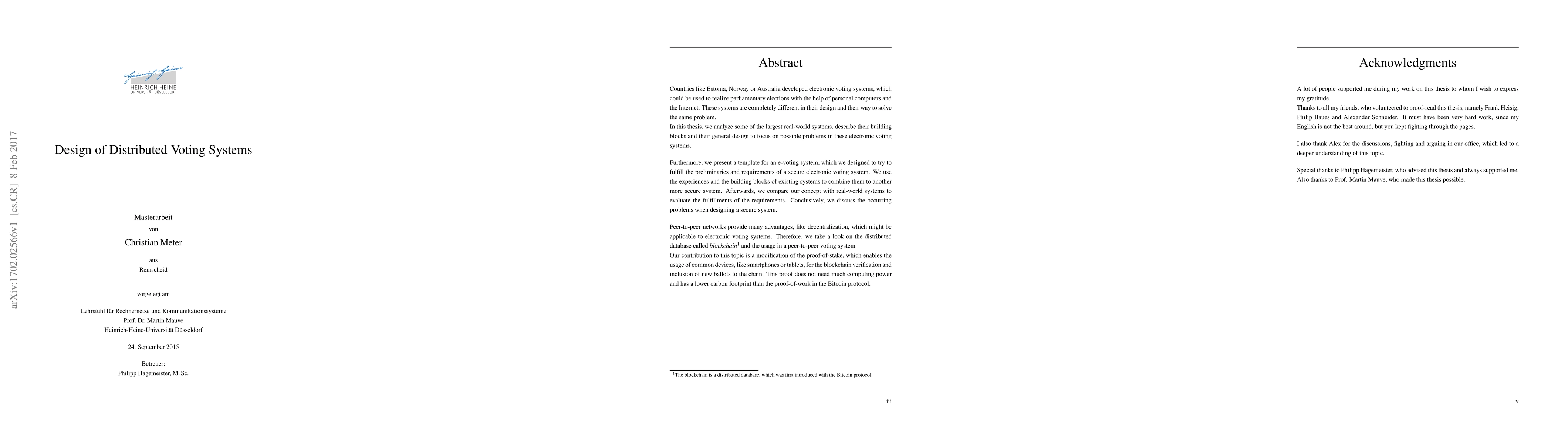 Countries like Estonia, Norway or Australia developed electronic voting systems, which could be used to realize parliamentary elections with the help of personal computers and the Internet. These systems are completely different in their design and their way to solve the same problem. In this thesis, we analyze some of the largest real-world systems, describe their building blocks and their general design to focus on possible problems in these electronic voting systems. Furthermore, we present a template for an e-voting system, which we designed to try to fulfill the preliminaries and requirements of a secure electronic voting system. We use the experiences and the building blocks of existing systems to combine them to another more secure system. Afterwards, we compare our concept with real-world systems to evaluate the fulfillments of the requirements. Conclusively, we discuss the occurring problems when designing a secure system. Peer-to-peer networks provide many advantages, like decentralization, which might be applicable to electronic voting systems. Therefore, we take a look on the distributed database called blockchain and the usage in a peer-to-peer voting system. Our contribution to this topic is a modification of the proof-of-stake, which enables the usage of common devices, like smartphones or tablets, for the blockchain verification and inclusion of new ballots to the chain. This proof does not need much computing power and has a lower carbon footprint than the proof-of-work in the Bitcoin protocol.