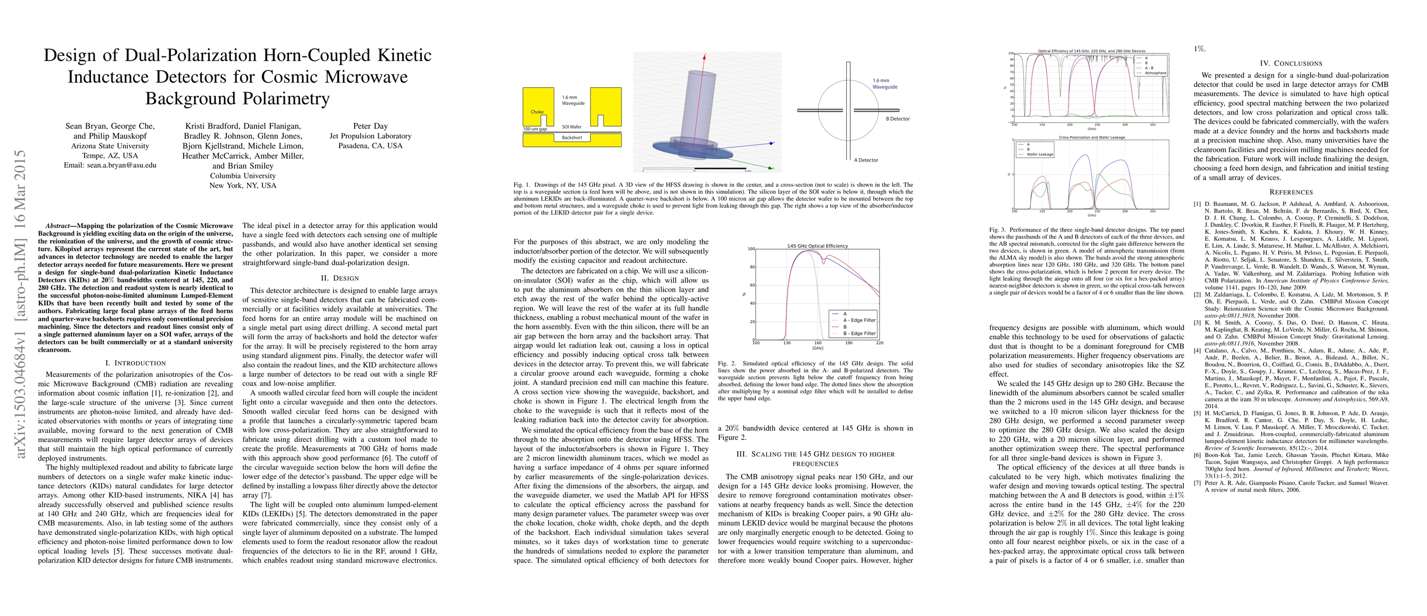 This paper presents a design for dual-polarization Kinetic Inductance Detectors (KIDs) for mapping the Cosmic Microwave Background's polarization, aiming to advance detector technology for future large-scale arrays. The design features single-band KIDs with 20% bandwidths at 145, 220, and 280 GHz, utilizing a cost-effective fabrication process suitable for commercial or university cleanroom production.