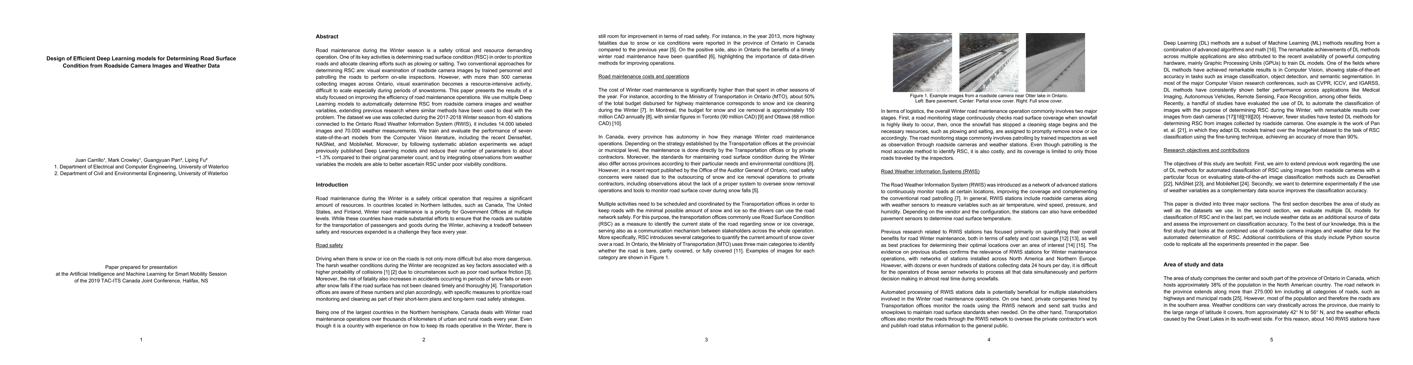 This paper explores the use of deep learning models to automatically determine road surface conditions from roadside camera images and weather data, aiming to improve the efficiency of winter road maintenance operations. The study evaluates seven state-of-the-art models, including DenseNet, NASNet, and MobileNet, and demonstrates significant parameter reduction and improved performance under poor visibility conditions.