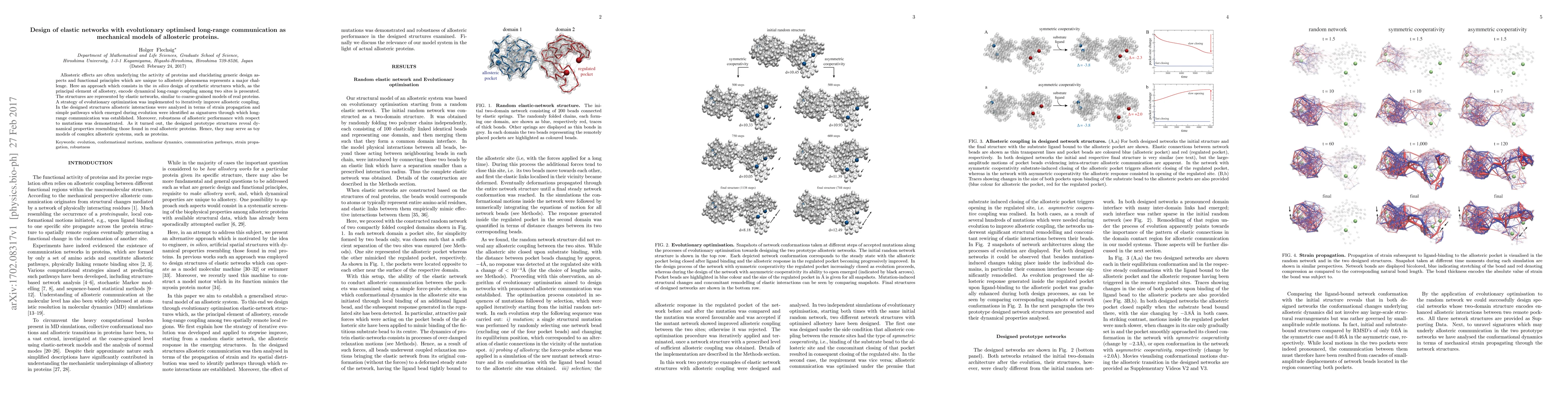 Allosteric effects are often underlying the activity of proteins and elucidating generic design aspects and functional principles which are unique to allosteric phenomena represents a major challenge. Here an approach which consists in the in silico design of synthetic structures which, as the principal element of allostery, encode dynamical long-range coupling among two sites is presented. The structures are represented by elastic networks, similar to coarse-grained models of real proteins. A strategy of evolutionary optimization was implemented to iteratively improve allosteric coupling. In the designed structures allosteric interactions were analyzed in terms of strain propagation and simple pathways which emerged during evolution were identified as signatures through which long-range communication was established. Moreover, robustness of allosteric performance with respect to mutations was demonstrated. As it turned out, the designed prototype structures reveal dynamical properties resembling those found in real allosteric proteins. Hence, they may serve as toy models of complex allosteric systems, such as proteins.