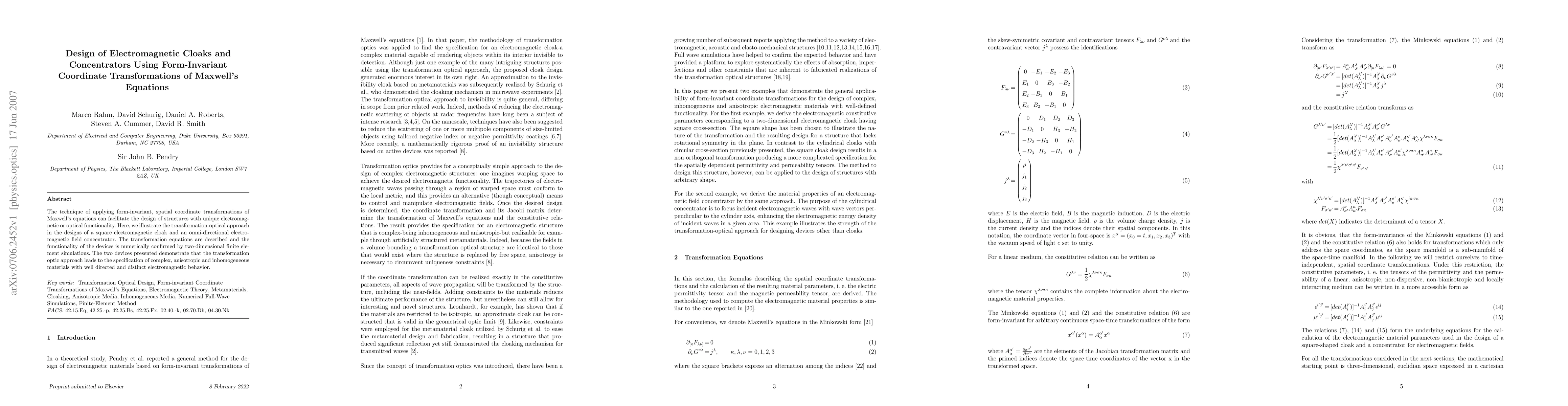 The technique of applying form-invariant, spatial coordinate transformations of Maxwell's equations can facilitate the design of structures with unique electromagnetic or optical functionality. Here, we illustrate the transformation-optical approach in the designs of a square electromagnetic cloak and an omni-directional electromagnetic field concentrator. The transformation equations are described and the functionality of the devices is numerically confirmed by two-dimensional finite element simulations. The two devices presented demonstrate that the transformation optic approach leads to the specification of complex, anisotropic and inhomogeneous materials with well directed and distinct electromagnetic behavior.