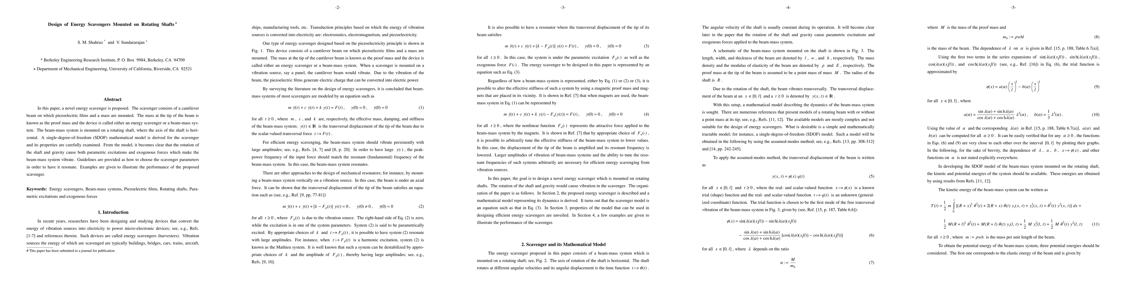In this paper, a novel energy scavenger is proposed. The scavenger consists of a cantilever beam on which piezoelectric films and a mass are mounted. The mass at the tip of the beam is known as the proof mass and the device is called either an energy scavenger or a beam-mass system. The beam-mass system is mounted on a rotating shaft, where the axis of the shaft is horizontal. A single-degree-of-freedom (SDOF) mathematical model is derived for the scavenger and its properties are carefully examined. From the model, it becomes clear that the rotation of the shaft and gravity cause both parametric excitations and exogenous forces which make the beam-mass system vibrate. Guidelines are provided as how to choose the scavenger parameters in order to have it resonate. Examples are given to illustrate the performance of the proposed scavenger.
