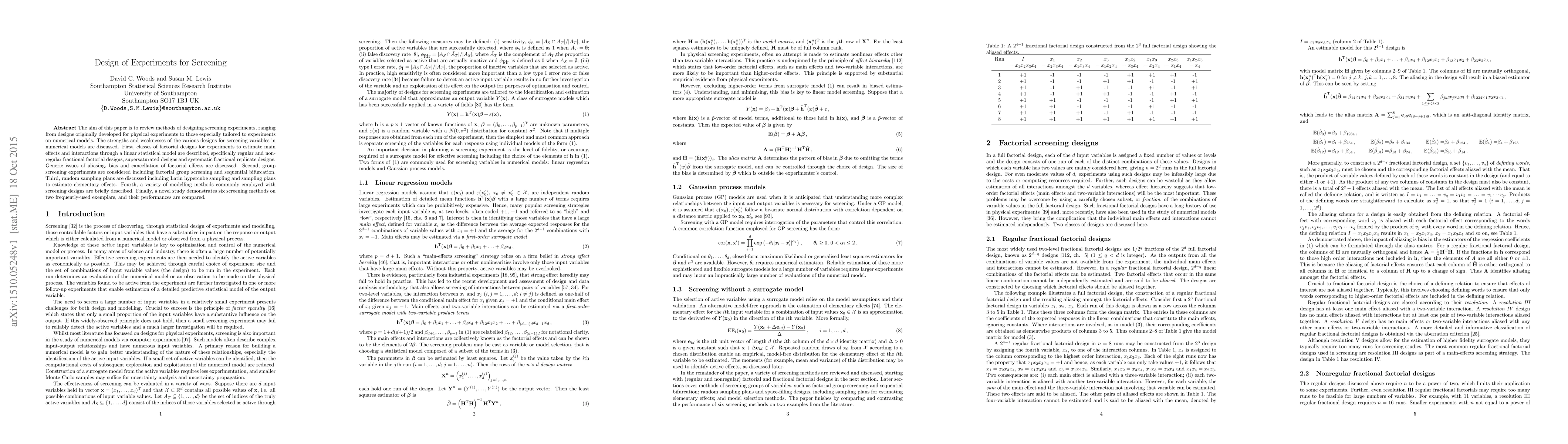 The aim of this paper is to review methods of designing screening experiments, ranging from designs originally developed for physical experiments to those especially tailored to experiments on numerical models. The strengths and weaknesses of the various designs for screening variables in numerical models are discussed. First, classes of factorial designs for experiments to estimate main effects and interactions through a linear statistical model are described, specifically regular and nonregular fractional factorial designs, supersaturated designs and systematic fractional replicate designs. Generic issues of aliasing, bias and cancellation of factorial effects are discussed. Second, group screening experiments are considered including factorial group screening and sequential bifurcation. Third, random sampling plans are discussed including Latin hypercube sampling and sampling plans to estimate elementary effects. Fourth, a variety of modelling methods commonly employed with screening designs are briefly described. Finally, a novel study demonstrates six screening methods on two frequently-used exemplars, and their performances are compared.
