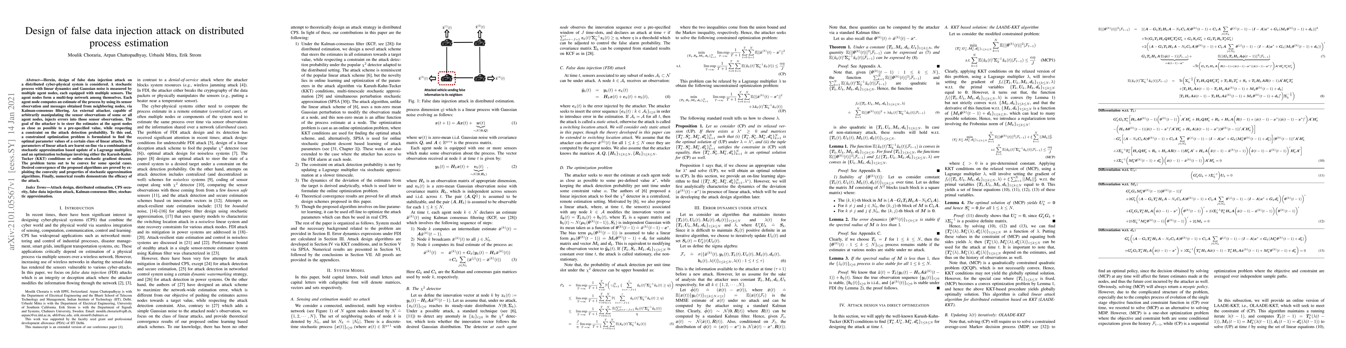 Herein, design of false data injection attack on a distributed cyber-physical system is considered. A stochastic process with linear dynamics and Gaussian noise is measured by multiple agent nodes, each equipped with multiple sensors. The agent nodes form a multi-hop network among themselves. Each agent node computes an estimate of the process by using its sensor observation and messages obtained from neighboring nodes, via Kalman-consensus filtering. An external attacker, capable of arbitrarily manipulating the sensor observations of some or all agent nodes, injects errors into those sensor observations. The goal of the attacker is to steer the estimates at the agent nodes as close as possible to a pre-specified value, while respecting a constraint on the attack detection probability. To this end, a constrained optimization problem is formulated to find the optimal parameter values of a certain class of linear attacks. The parameters of linear attack are learnt on-line via a combination of stochastic approximation based update of a Lagrange multiplier, and an optimization technique involving either the Karush-Kuhn-Tucker (KKT) conditions or online stochastic gradient descent. The problem turns out to be convex for some special cases. Desired convergence of the proposed algorithms are proved by exploiting the convexity and properties of stochastic approximation algorithms. Finally, numerical results demonstrate the efficacy of the attack.