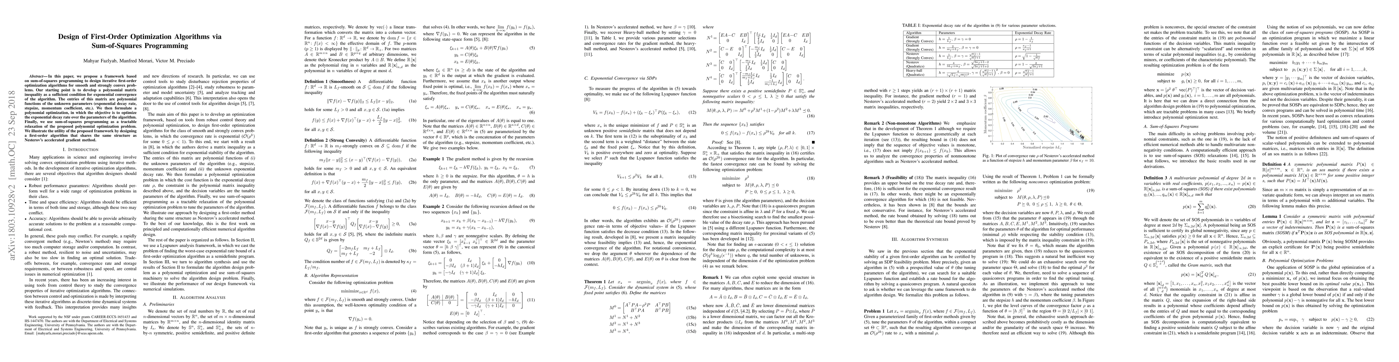 Researchers propose a framework for designing first-order optimization algorithms using sum-of-squares programming, enabling exponential convergence for smooth convex problems. They illustrate the utility of this approach by designing an algorithm based on Nesterov's accelerated gradient method.