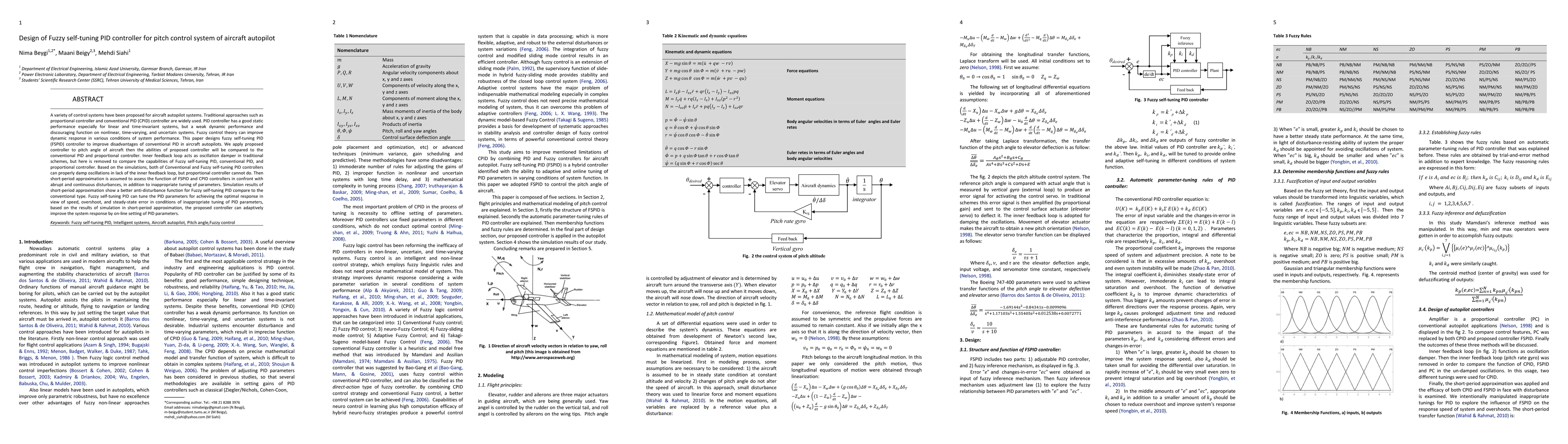 A variety of control systems have been proposed for aircraft autopilot systems. Traditional approaches such as proportional controller and conventional PID (CPID) controller are widely used. PID controller has a good static performance especially for linear and time-invariant systems, but a weak dynamic performance and discouraging function on nonlinear, time-varying, and uncertain systems. Fuzzy control theory can improve dynamic response in various conditions of system performance. This paper designs fuzzy self-tuning PID (FSPID) controller to improve disadvantages of conventional PID in aircraft autopilots. We apply proposed controller to pitch angle of aircraft then the abilities of proposed controller will be compared to the conventional PID and proportional controller. Inner feedback loop acts as oscillation damper in traditional schemes, but here is removed to compare the capabilities of Fuzzy self-tuning PID, conventional PID, and proportional controller. Based on the simulations, both of Conventional and Fuzzy self-tuning PID controllers can properly damp oscillations in lack of the inner feedback loop, but proportional controller cannot do. Then short-period approximation is assumed to assess the function of FSPID and CPID controllers in confront with abrupt and continuous disturbances, in addition to inappropriate tuning of parameters. Simulation results of short-period approximation show a better anti-disturbance function for Fuzzy self-tuning PID compare to the conventional type. Fuzzy self-tuning PID can tune the PID parameters for achieving the optimal response in view of speed, overshoot, and steady-state error in conditions of inappropriate tuning of PID parameters, based on the results of simulation in short-period approximation, the proposed controller can adaptively improve the system response by on-line setting of PID parameters.