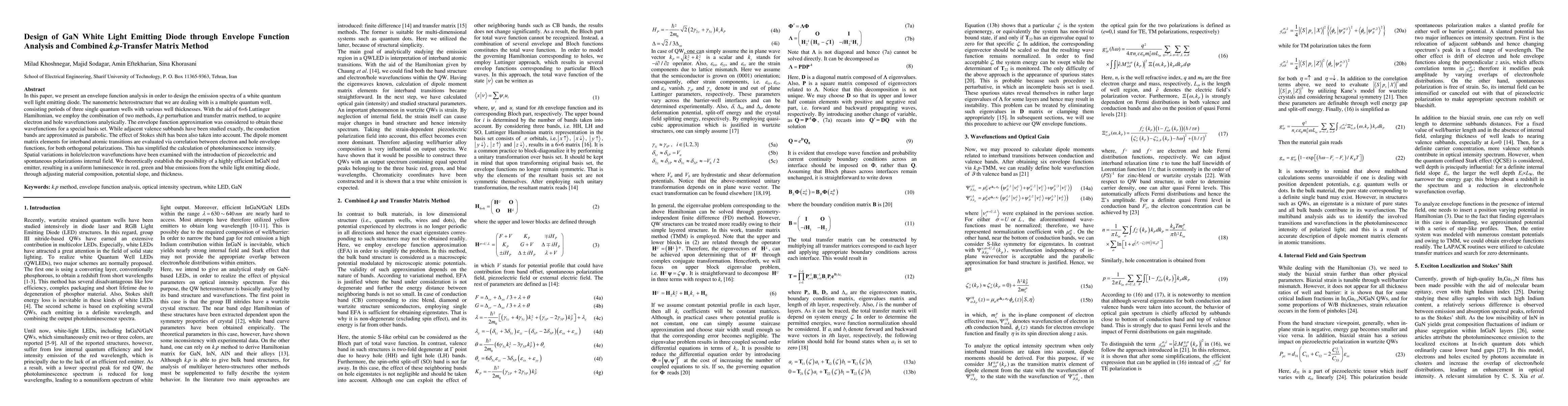 This paper uses an envelope function analysis and a combined k.p-transfer matrix method to design a GaN white light emitting diode with multiple quantum wells. The study evaluates dipole moment matrix elements and considers polarization effects to achieve uniform luminescence across red, green, and blue emissions.