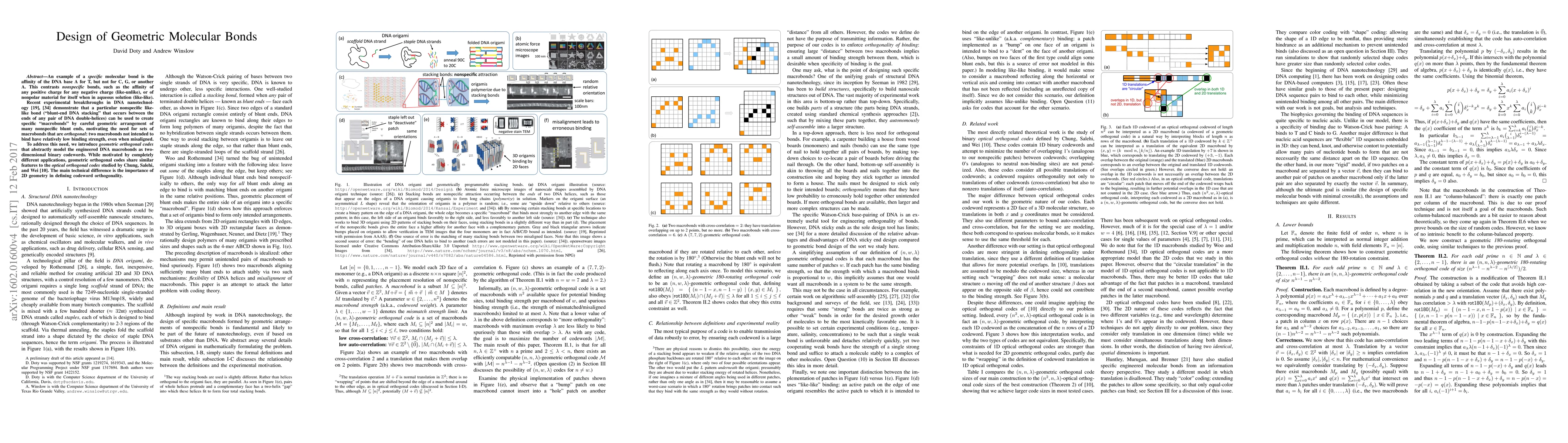 An example of a nonspecific molecular bond is the affinity of any positive charge for any negative charge (like-unlike), or of nonpolar material for itself when in aqueous solution (like-like). This contrasts specific bonds such as the affinity of the DNA base A for T, but not for C, G, or another A. Recent experimental breakthroughs in DNA nanotechnology demonstrate that a particular nonspecific like-like bond ("blunt-end DNA stacking" that occurs between the ends of any pair of DNA double-helices) can be used to create specific "macrobonds" by careful geometric arrangement of many nonspecific blunt ends, motivating the need for sets of macrobonds that are orthogonal: two macrobonds not intended to bind should have relatively low binding strength, even when misaligned. To address this need, we introduce geometric orthogonal codes that abstractly model the engineered DNA macrobonds as two-dimensional binary codewords. While motivated by completely different applications, geometric orthogonal codes share similar features to the optical orthogonal codes studied by Chung, Salehi, and Wei. The main technical difference is the importance of 2D geometry in defining codeword orthogonality.