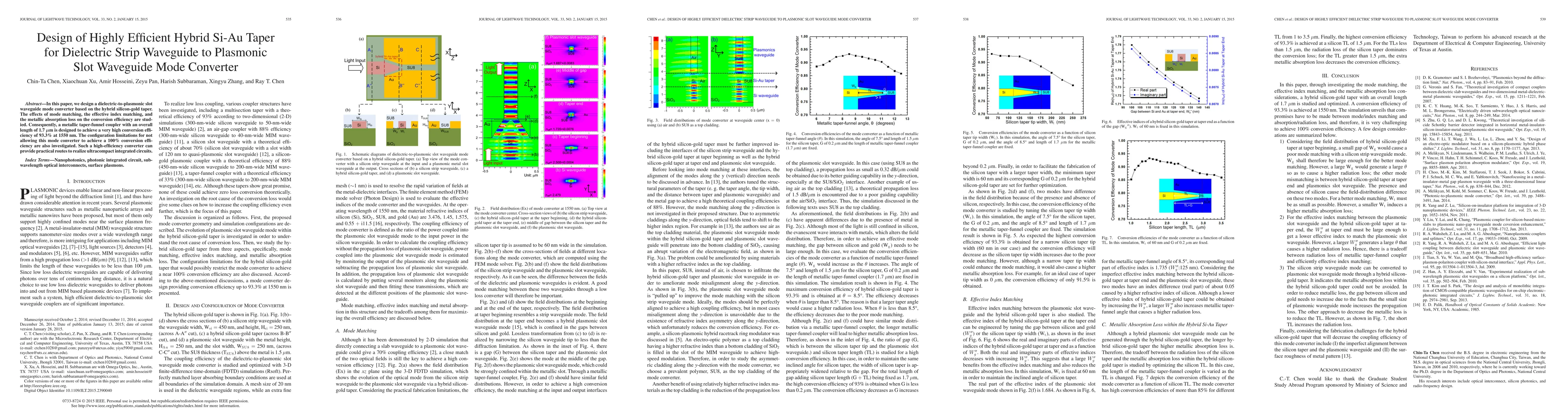 This paper designs a highly efficient hybrid Si-Au taper for converting dielectric strip waveguide modes to plasmonic slot waveguide modes, achieving 93.3% efficiency at 1550 nm. The study explores mode matching, effective index matching, and metallic absorption loss, and investigates the limitations preventing 100% efficiency.