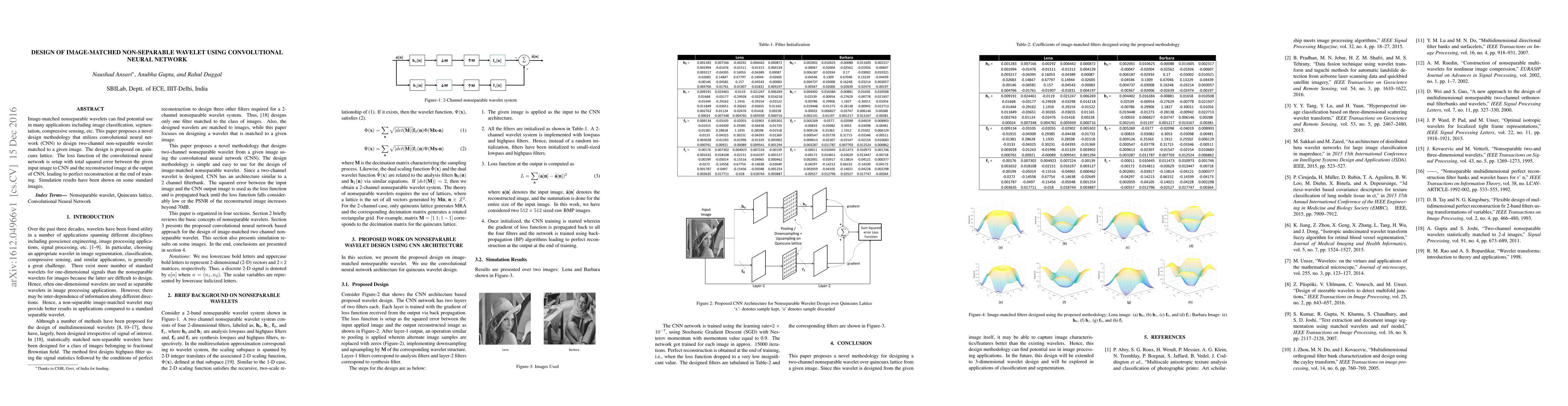 This paper proposes a novel CNN-based methodology for designing image-matched non-separable wavelets on a quincunx lattice, achieving perfect reconstruction of input images through a loss function based on total squared error. Simulation results demonstrate the effectiveness on standard images.