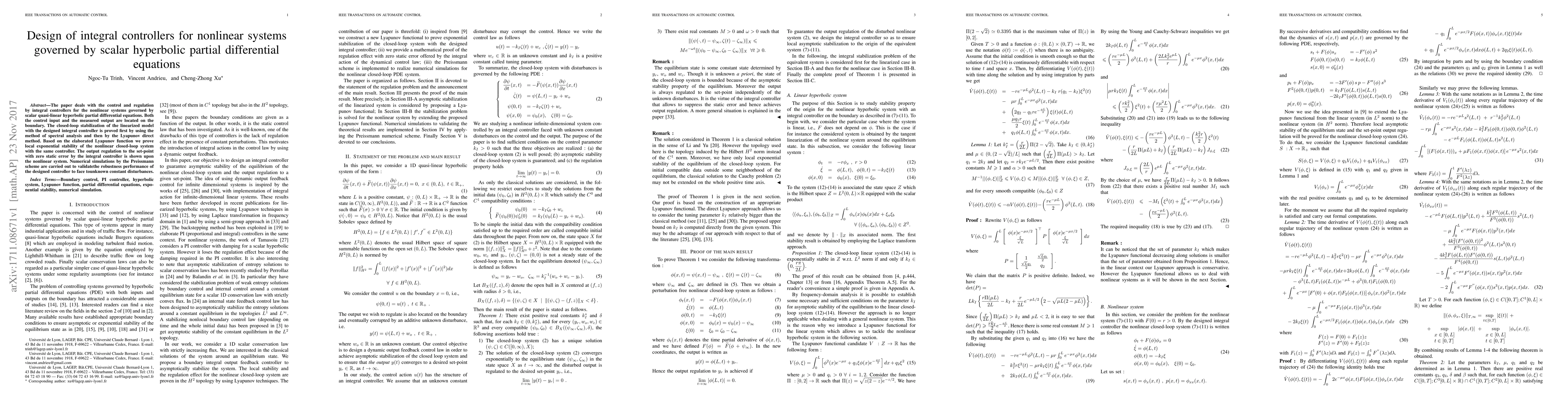 The paper presents a design for integral controllers to stabilize and regulate nonlinear systems described by scalar hyperbolic PDEs. Utilizing spectral analysis and Lyapunov methods, the research proves closed-loop stability and local exponential stability for the linearized and nonlinear systems, respectively. Numerical simulations demonstrate the controller's robustness against constant disturbances.