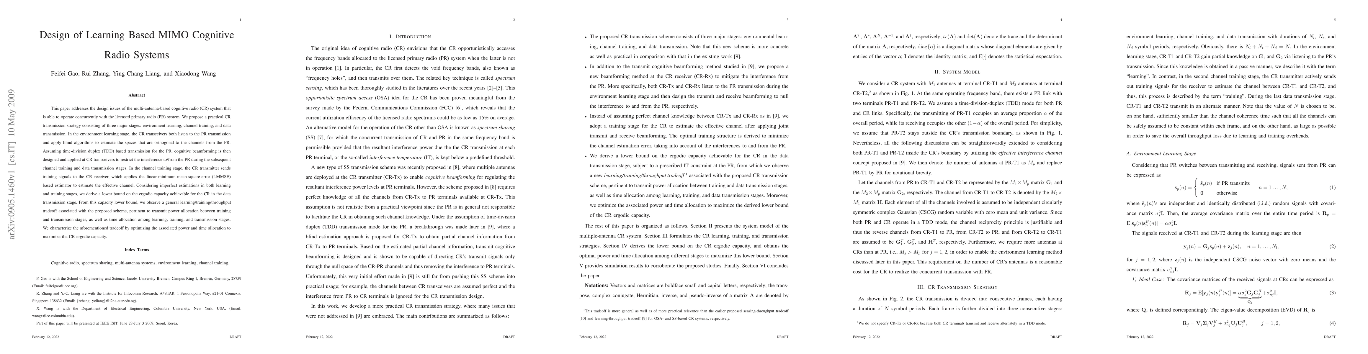This paper addresses the design issues of the multi-antenna-based cognitive radio (CR) system that is able to operate concurrently with the licensed primary radio (PR) system. We propose a practical CR transmission strategy consisting of three major stages: environment learning, channel training, and data transmission. In the environment learning stage, the CR transceivers both listen to the PR transmission and apply blind algorithms to estimate the spaces that are orthogonal to the channels from the PR. Assuming time-division duplex (TDD) based transmission for the PR, cognitive beamforming is then designed and applied at CR transceivers to restrict the interference to/from the PR during the subsequent channel training and data transmission stages. In the channel training stage, the CR transmitter sends training signals to the CR receiver, which applies the linear-minimum-mean-square-error (LMMSE) based estimator to estimate the effective channel. Considering imperfect estimations in both learning and training stages, we derive a lower bound on the ergodic capacity achievable for the CR in the data transmission stage. From this capacity lower bound, we observe a general learning/training/throughput tradeoff associated with the proposed scheme, pertinent to transmit power allocation between training and transmission stages, as well as time allocation among learning, training, and transmission stages. We characterize the aforementioned tradeoff by optimizing the associated power and time allocation to maximize the CR ergodic capacity.