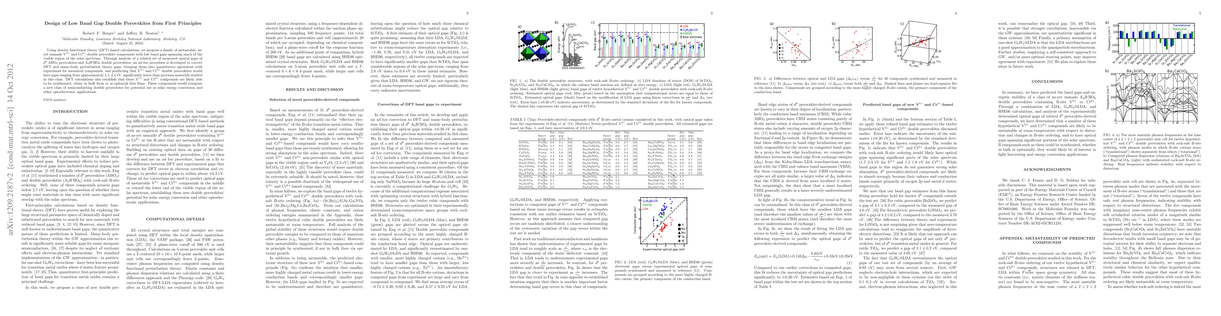 This paper proposes a new family of metastable V5+ and Cr6+ double perovskite compounds with low band gaps, predicted to range from 1.1-2.4 eV, using DFT-based calculations. These materials could potentially be synthesized and offer promising optoelectronic applications, especially in solar energy conversion.