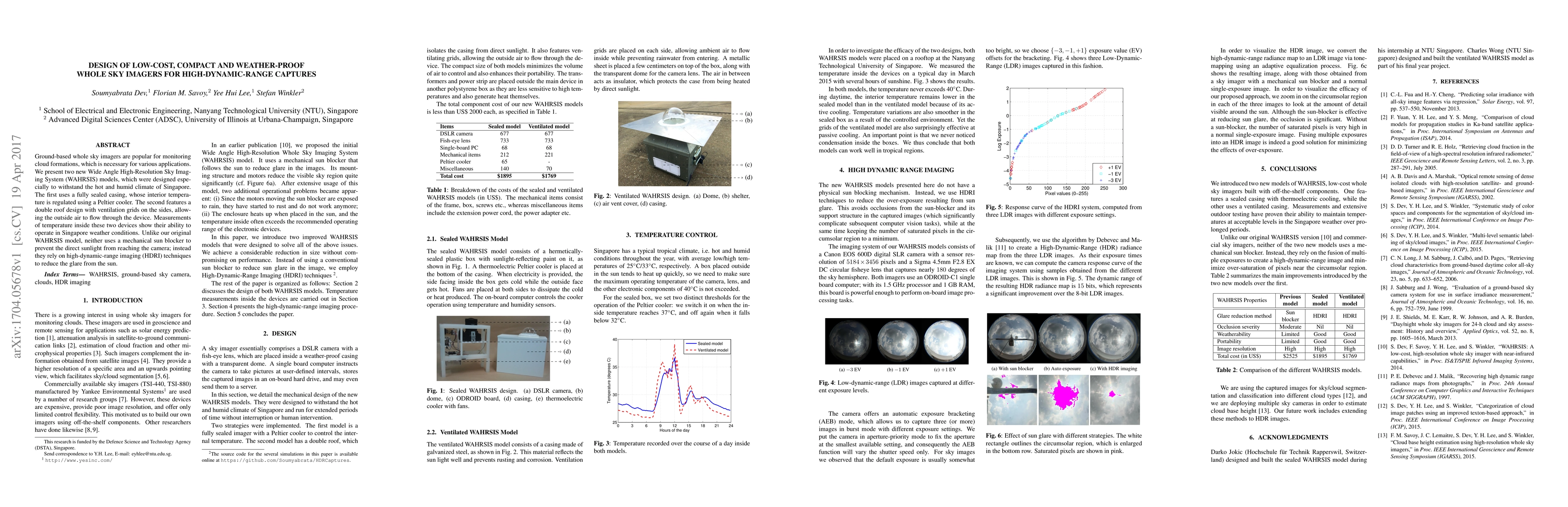 This paper presents two new low-cost, compact, and weather-proof whole sky imagers designed for high-dynamic-range captures, specifically tailored for Singapore's hot and humid climate. Both models use advanced HDRI techniques instead of mechanical sun blockers to manage sunlight glare.