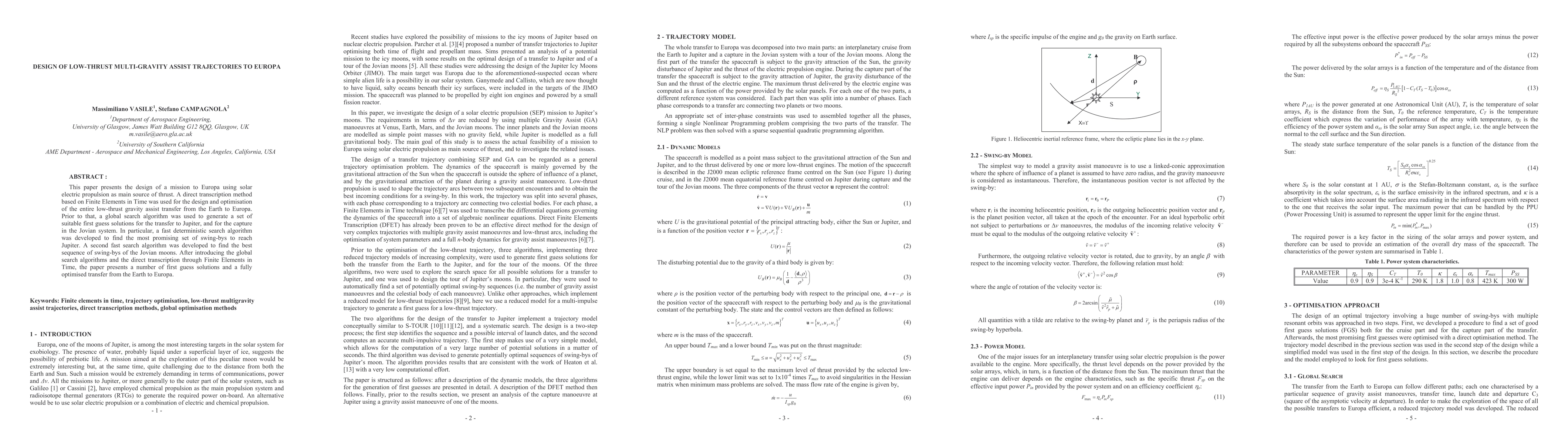 This paper designs a low-thrust gravity assist mission to Europa using solar electric propulsion, optimizing the trajectory using a direct transcription method based on Finite Elements in Time. It employs global search algorithms to identify optimal swing-by sequences for reaching Jupiter and capturing Europa.