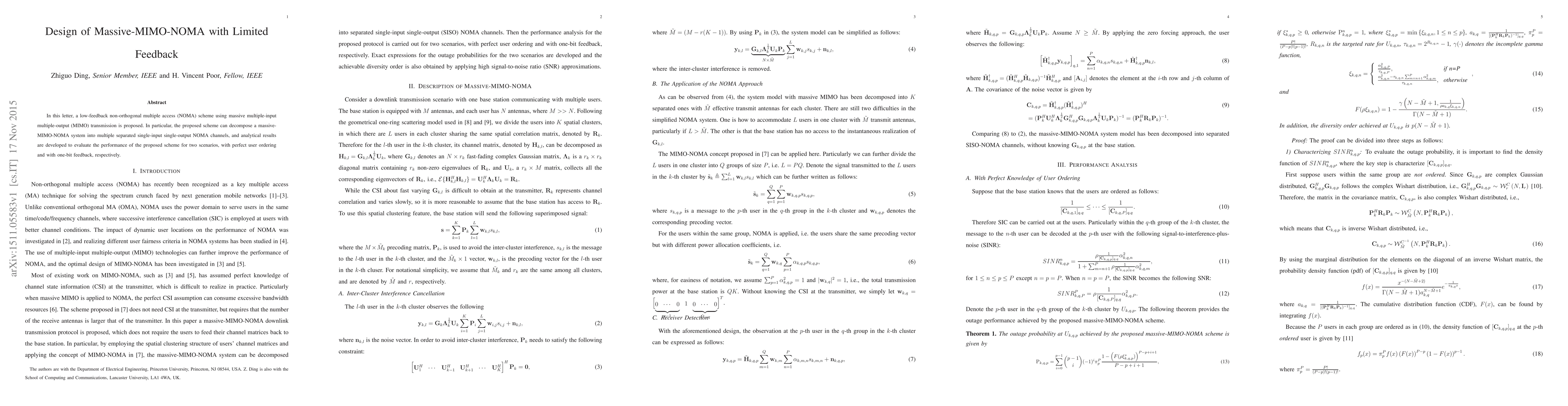 This paper proposes a low-feedback NOMA scheme for massive-MIMO systems, decomposing them into single-input single-output NOMA channels. Analytical performance evaluations are conducted for scenarios with perfect user ordering and one-bit feedback.