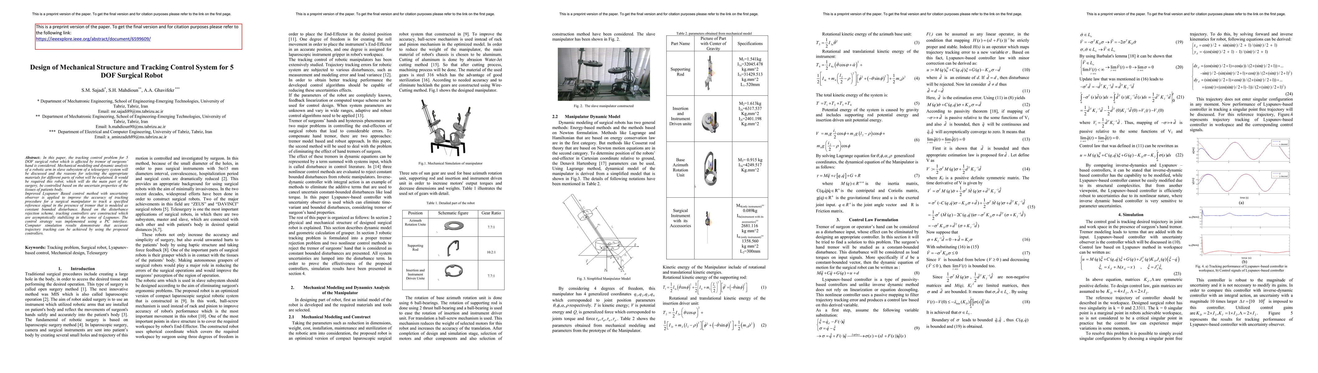 In this paper, the tracking control problem for 5 DOF surgical robot which is affected by tremor of surgeons' hand is considered. Mechanical modeling and dynamic analysis of a robotic arm in slave subsystem of a telesurgery system will be discussed and the reasons for selecting the appropriate materials for different parts of robot will be explained. It would be required this robot, which will do the main part of the surgery, be controlled based on the uncertain properties of the tissues of patients body. Improved Lyapunov Based control method with uncertainty observer is applied to improve the accuracy of tracking procedure for a surgical manipulator to track a specified reference signal in the presence of tremor that is modeled as constant bounded disturbance. Based on the disturbance rejection scheme, tracking controllers are constructed which are asymptotically stabilizing in the sense of Lyapunov. The control strategy was implemented using a PC interface. Computer simulation results demonstrate that accurate trajectory tracking can be achieved by using the proposed controllers.