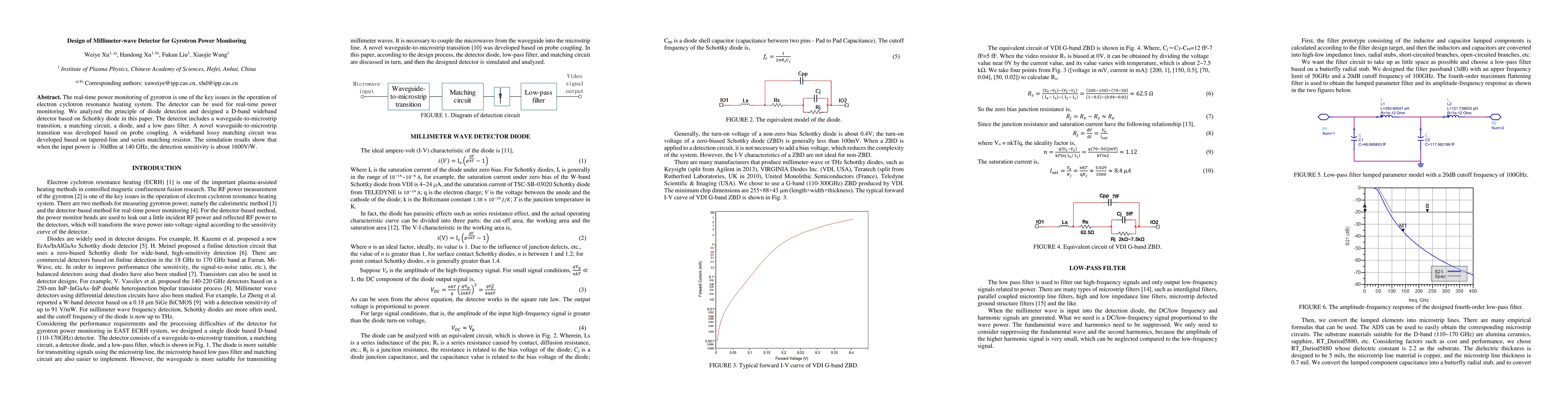 This paper presents a design for a millimeter-wave detector using a Schottky diode for real-time gyrotron power monitoring in electron cyclotron resonance heating systems. The detector, operating at the D-band and 140 GHz, features a novel waveguide-to-microstrip transition and a wideband lossy matching circuit. Simulation results indicate a detection sensitivity of approximately 1600V/W at an input power of -30dBm.