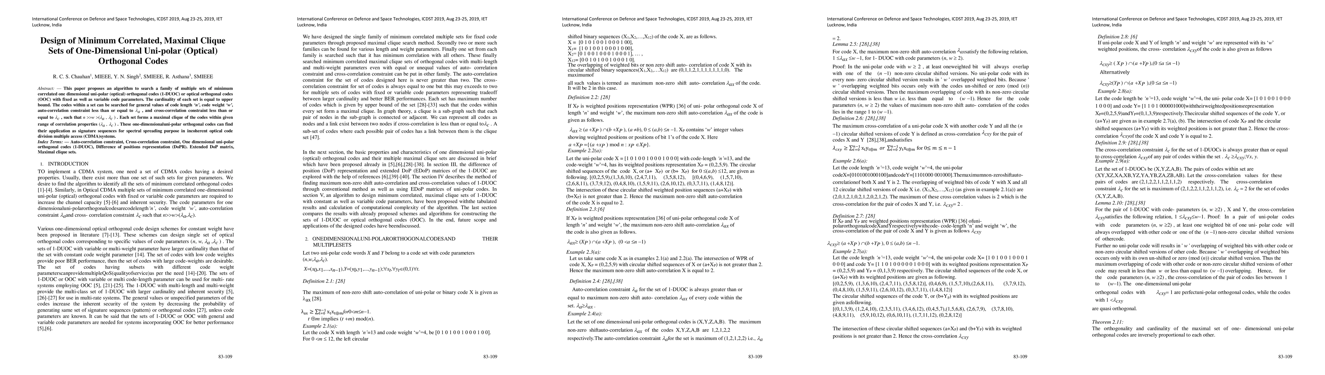 This paper proposes an algorithm to search a family of multiple sets of minimum correlated one dimensional uni-polar (optical) orthogonal codes (1-DUOC) or optical orthogonal codes (OOC) with fixed as well as variable code parameters. The cardinality of each set is equal to upper bound. The codes within a set can be searched for general values of code length, code weight, auto-correlation constraint and cross-correlation constraint. Each set forms a maximal clique of the codes within given range of correlation properties . These one-dimensional uni-polar orthogonal codes can find their application as signature sequences for spectral spreading purpose in incoherent optical code division multiple access (CDMA) systems.