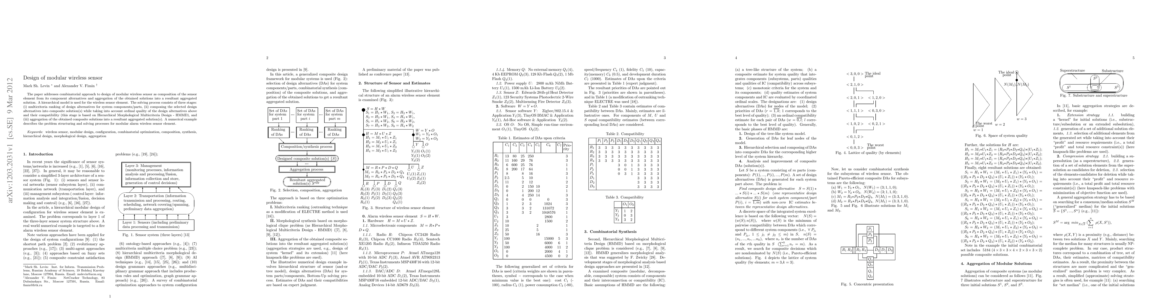 The paper addresses combinatorial approach to design of modular wireless sensor as composition of the sensor element from its component alternatives and aggregation of the obtained solutions into a resultant aggregated solution. A hierarchical model is used for the wireless sensor element. The solving process consists of three stages: (i) multicriteria ranking of design alternatives for system components/parts, (ii) composing the selected design alternatives into composite solution(s) while taking into account ordinal quality of the design alternatives above and their compatibility (this stage is based on Hierarchical Morphological Multicriteria Design - HMMD), and (iii) aggregation of the obtained composite solutions into a resultant aggregated solution(s). A numerical example describes the problem structuring and solving processes for modular alarm wireless sensor element.