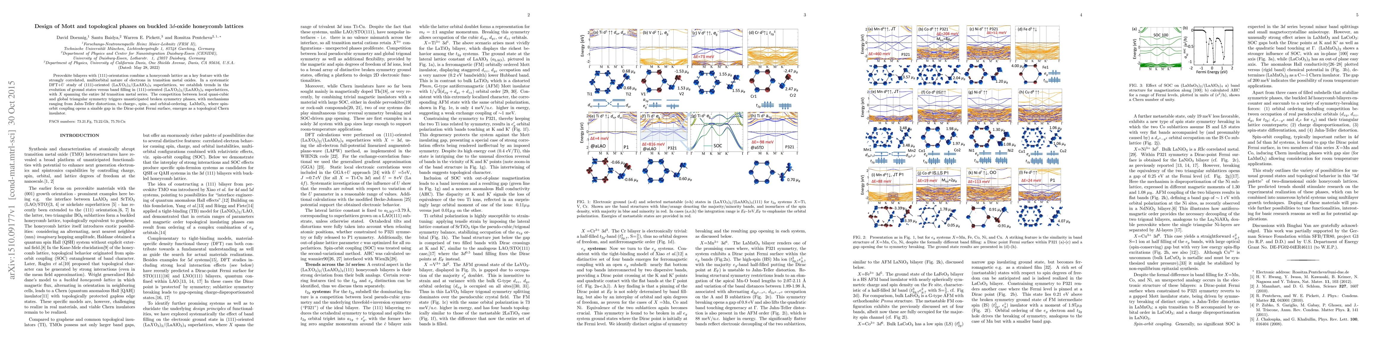 Perovskite bilayers with (111)-orientation combine a honeycomb lattice as a key feature with the strongly correlated, multiorbital nature of electrons in transition metal oxides. In a systematic DFT+$U$ study of (111)-oriented (La$X$O$_3$)$_2$/(LaAlO$_3$)$_4$ superlattices, we establish trends in the evolution of ground states versus band filling in (111)-oriented (La$X$O$_3$)$_2$/(LaAlO$_3$)$_4$ superlattices, with $X$ spanning the entire $3d$ transition metal series. The competition between local quasi-cubic and global triangular symmetry triggers unanticipated broken symmetry phases, with mechanisms ranging from Jahn-Teller distortions, to charge-, spin-, and orbital-ordering. LaMnO$_3$, where spin-orbit coupling opens a sizable gap in the Dirac-point Fermi surface, emerges as a topological Chern insulator.