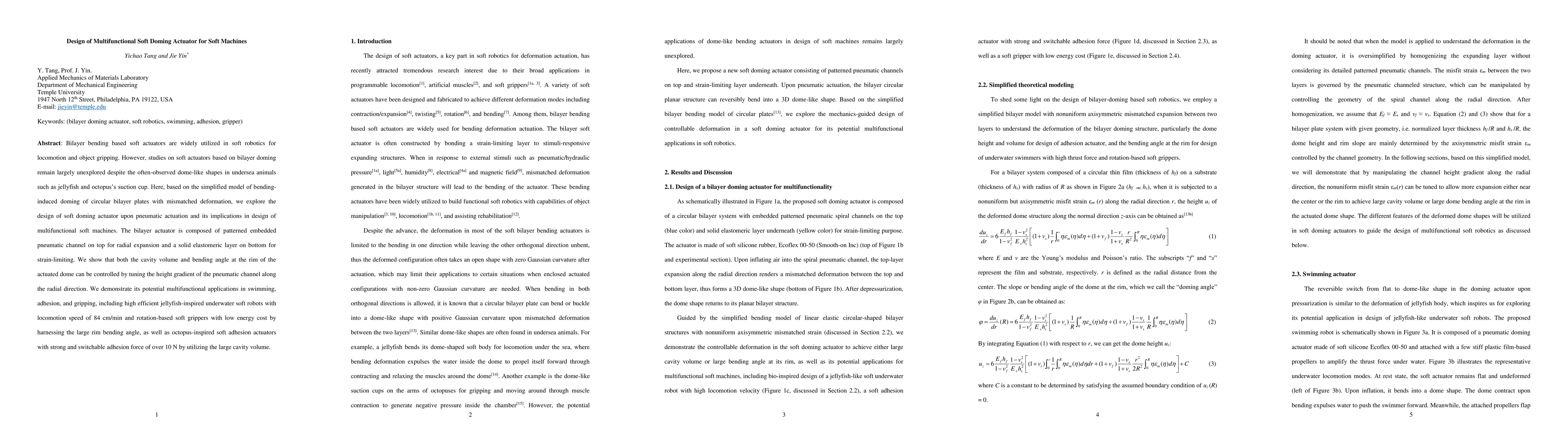 This paper designs a multifunctional soft doming actuator based on bilayer bending, utilizing pneumatic actuation to control the dome shape. The actuator, composed of a patterned pneumatic channel and a solid elastomeric layer, enables applications in swimming, adhesion, and gripping, demonstrating efficient underwater locomotion and strong, switchable adhesion forces.