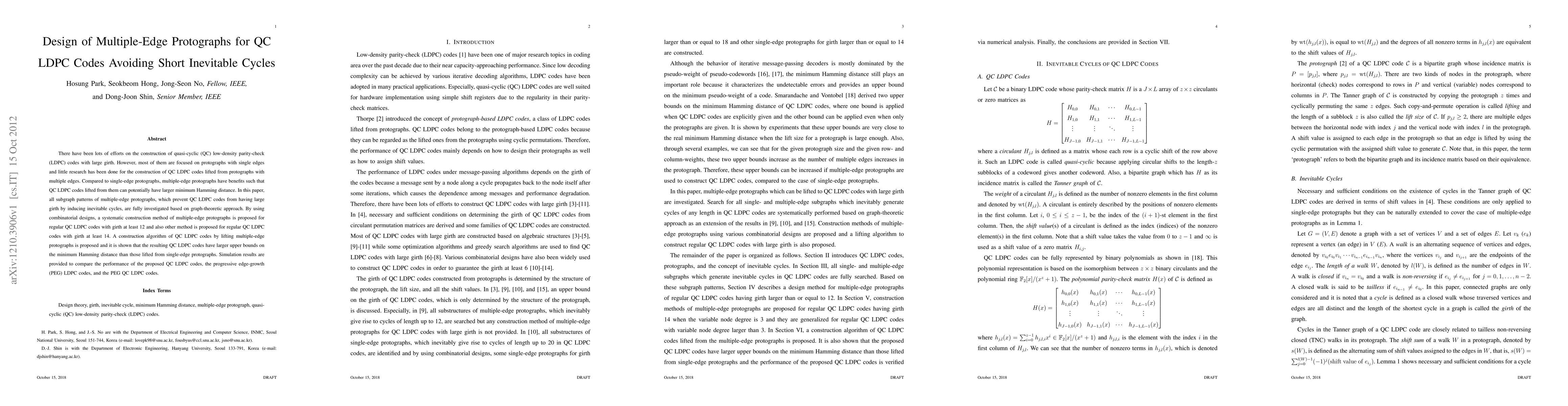 This paper investigates the design of multiple-edge protographs for quasi-cyclic low-density parity-check (QC LDPC) codes to avoid short inevitable cycles, proposing systematic construction methods for codes with girth at least 12 and 14. It demonstrates that QC LDPC codes derived from multiple-edge protographs potentially achieve larger minimum Hamming distances compared to those from single-edge protographs.