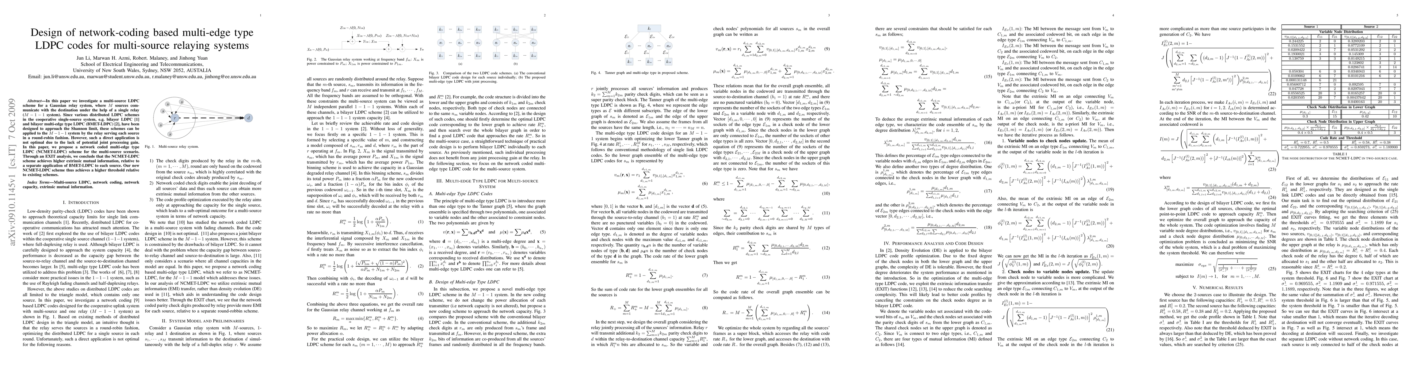 This paper proposes a network coded multi-edge type LDPC scheme (NCMET-LDPC) for multi-source relaying systems, achieving higher extrinsic mutual information and a better threshold compared to separate applications of bilayer multi-edge type LDPC (BMET-LDPC) to each source.