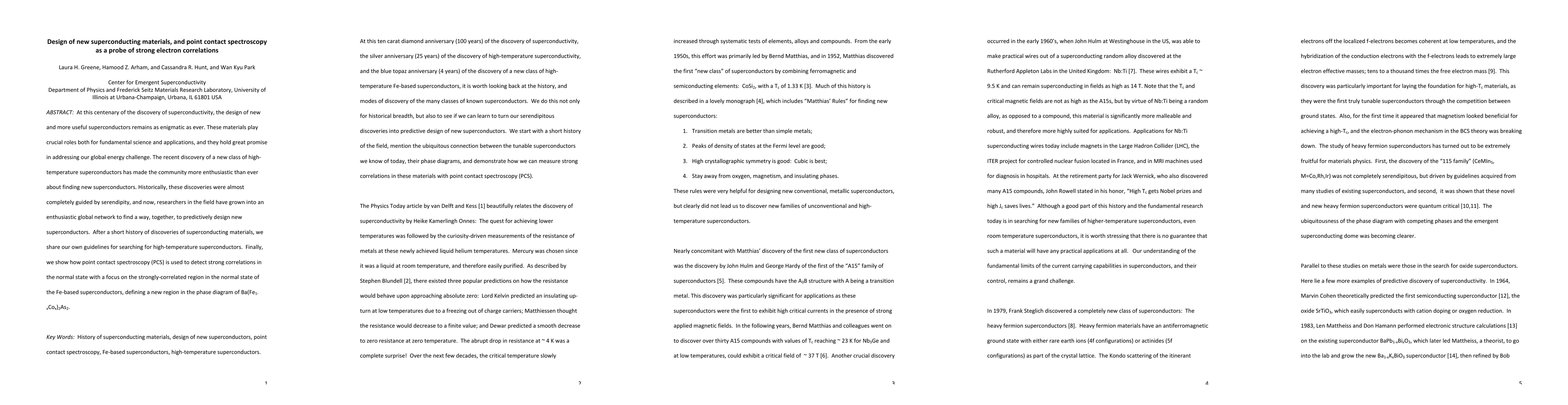 At this centenary of the discovery of superconductivity, the design of new and more useful superconductors remains as enigmatic as ever. These materials play crucial roles both for fundamental science and applications, and they hold great promise in addressing our global energy challenge. The recent discovery of a new class of high-temperature superconductors has made the community more enthusiastic than ever about finding new superconductors. Historically, these discoveries were almost completely guided by serendipity, and now, researchers in the field have grown into an enthusiastic global network to find a way, together, to predictively design new superconductors. After a short history of discoveries of superconducting materials, we share our own guidelines for searching for high-temperature superconductors. Finally, we show how point contact spectroscopy (PCS) is used to detect strong correlations in the normal state with a focus on the strongly-correlated region in the normal state of the Fe-based superconductors, defining a new region in the phase diagram of Ba(Fe1-xCox)2As2.