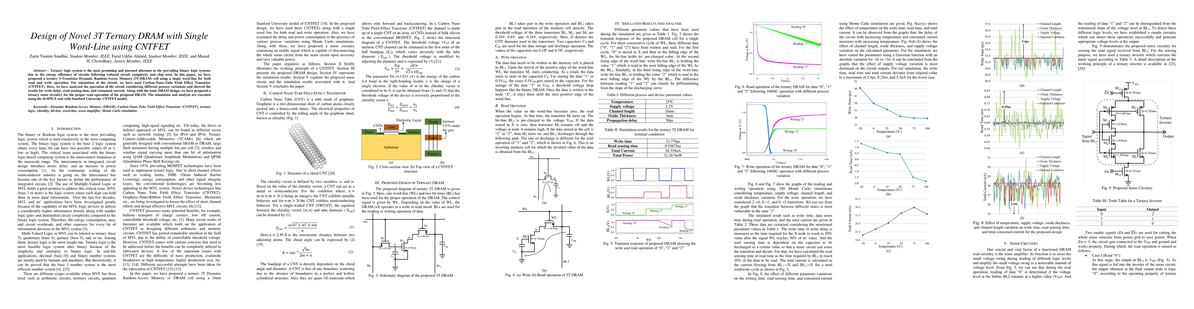 Ternary logic system is the most promising and pursued alternate to the prevailing binary logic systems due to the energy efficiency of circuits following reduced circuit complexity and chip area. In this paper, we have proposed a ternary 3-Transistor Dynamic Random-Access Memory (3T-DRAM) cell using a single word-line for both read and write operation. For simulation of the circuit, we have used Carbon-Nano-Tube Field Effect Transistor (CNTFET). Here, we have analyzed the operation of the circuit considering different process variations and showed the results for write delay, read sensing time, and consumed current. Along with the basic DRAM design, we have proposed a ternary sense circuitry for the proper read operation of the proposed DRAM. The simulation and analysis are executed using the H-SPICE tool with Stanford University CNTFET model.