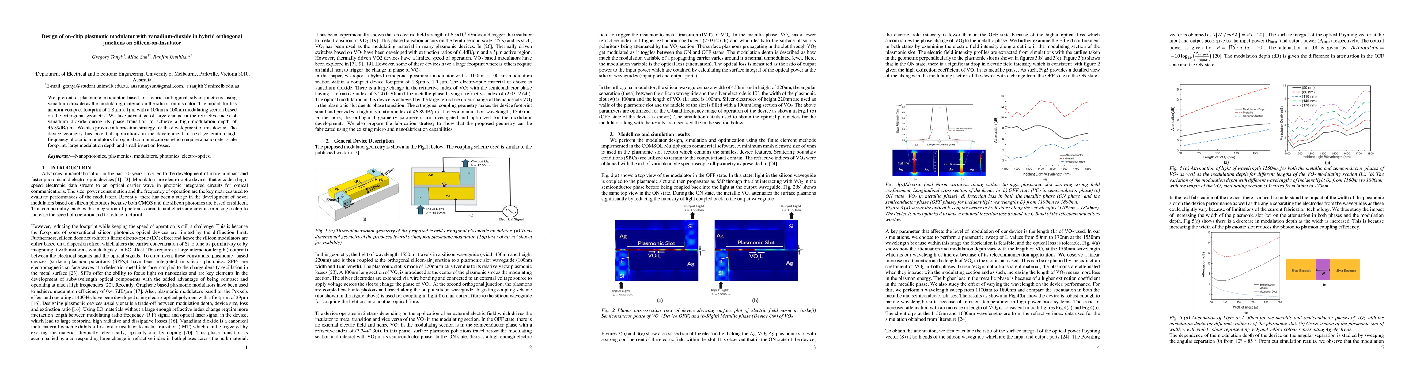 This paper details a compact plasmonic modulator utilizing vanadium dioxide on a silicon-on-insulator platform, achieving a high modulation depth of 46.89dB/μm through hybrid orthogonal silver junctions. The design promises significant applications in next-generation high-frequency photonic modulators for optical communications.